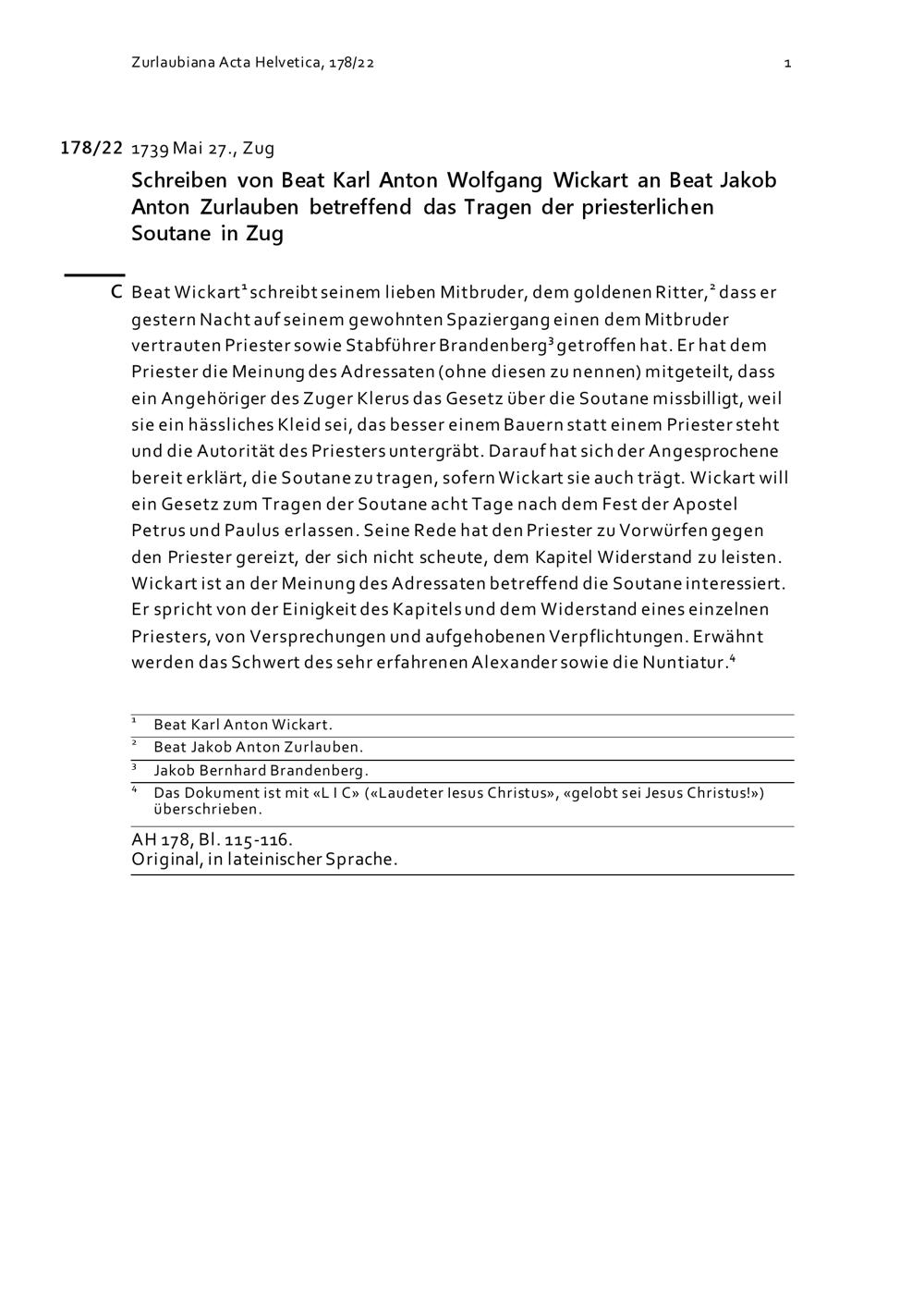 Schreiben von Beat Karl Anton Wolfgang Wickart an Beat Jakob Anton Zurlauben betreffend das Tragen der priesterlichen Soutane in Zug
