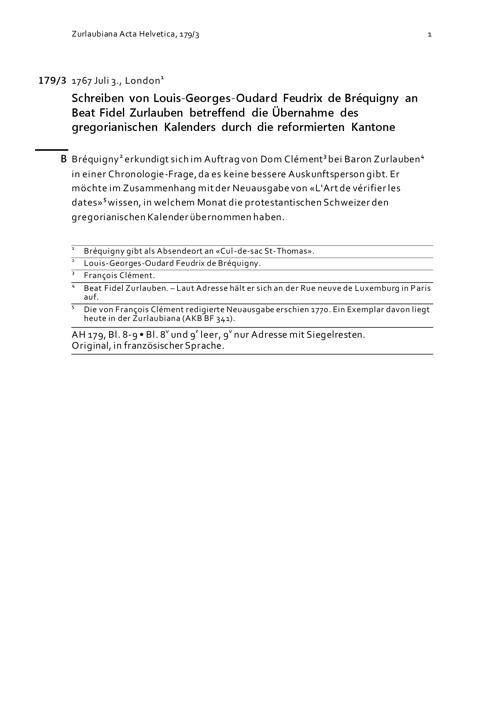 Schreiben von Louis-Georges-Oudard Feudrix de Bréquigny an Beat Fidel Zurlauben betreffend die Übernahme des gregorianischen Kalenders durch die reformierten Eidgenossen