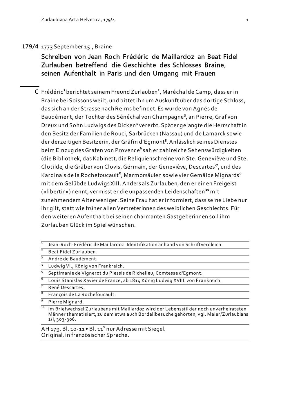 Schreiben von Jean-Roch-Frédéric de Maillardoz an Beat Fidel Zurlauben betreffend die Geschichte des Schlosses Braine, seinen Aufenthalt in Paris und den Umgang mit Frauen