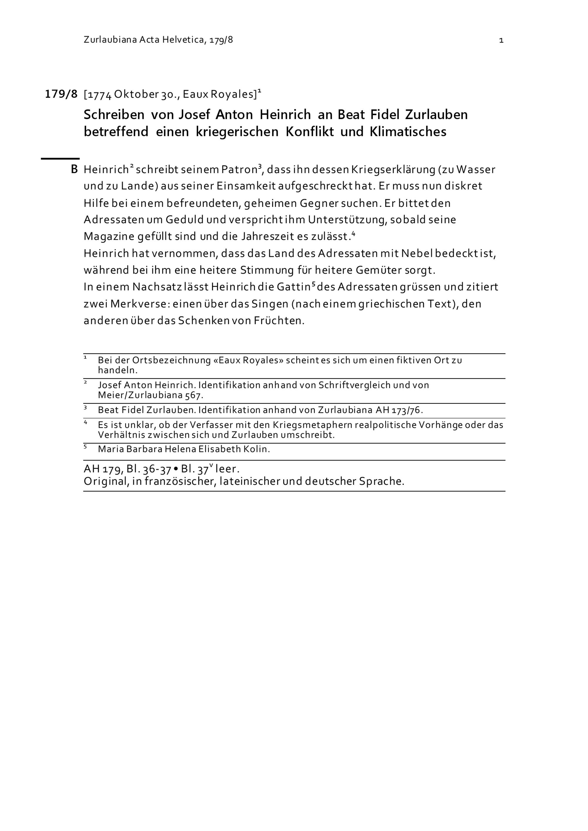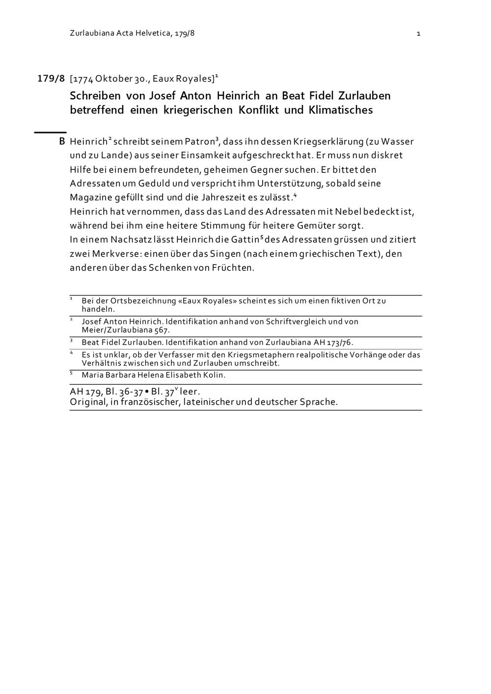 Schreiben von Josef Anton Heinrich an Beat Fidel Zurlauben betreffend einen kriegerischen...
