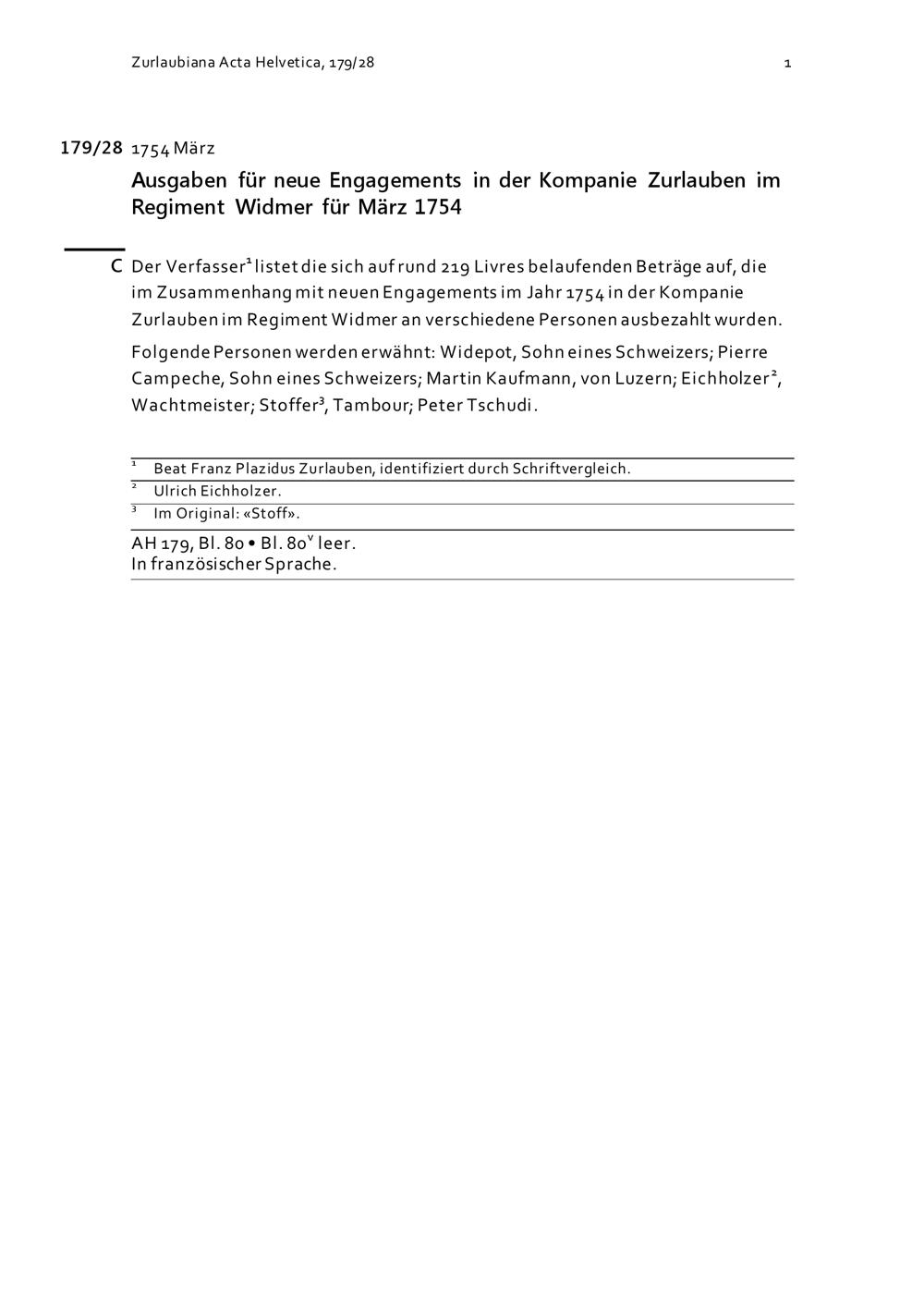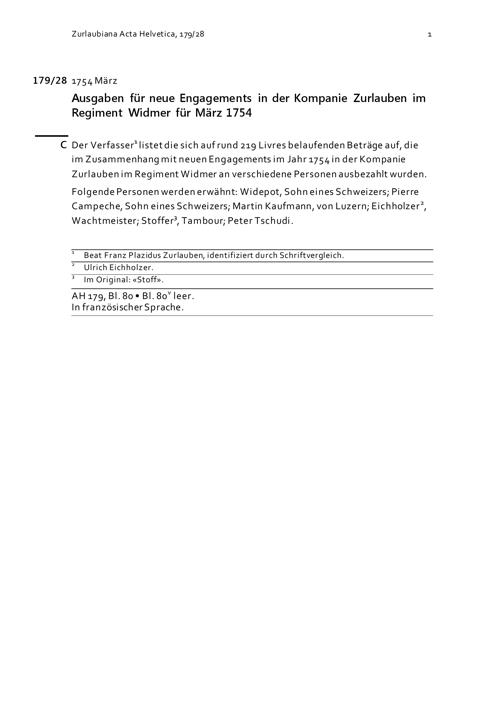 Ausgaben für neue Engagements in der Kompanie Zurlauben im Regiment Widmer für März 1754