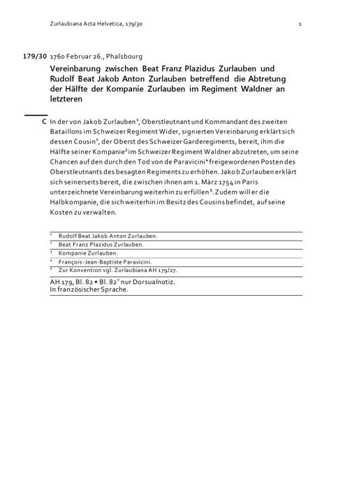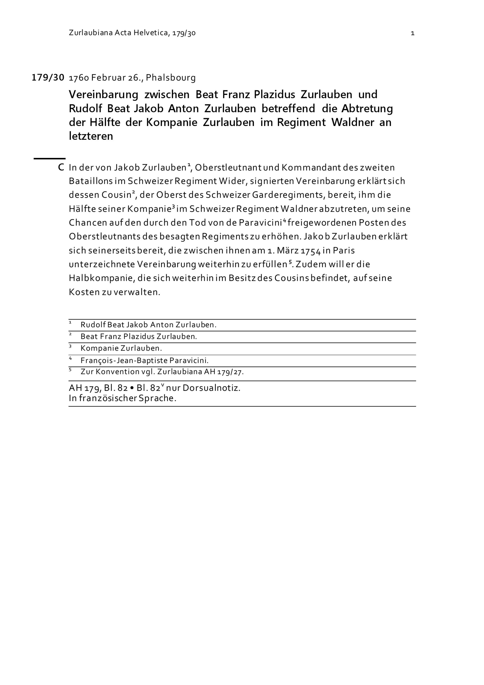Vereinbarung zwischen Beat Franz Plazidus Zurlauben und Rudolf Beat Jakob Anton Zurlauben betreffend die Abtretung der Hälfte der Kompanie Zurlauben im Regiment Waldner an letzteren