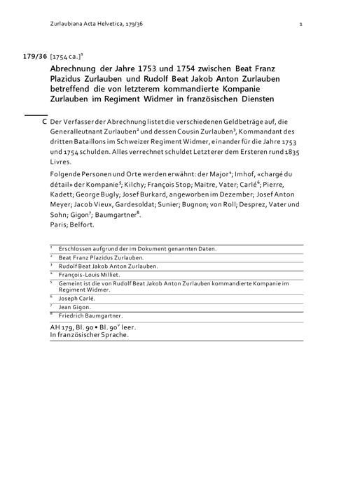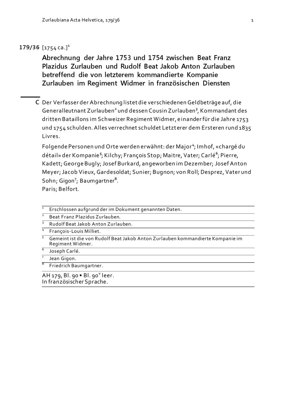 Abrechnung der Jahre 1753 und 1754 zwischen Beat Franz Plazidus Zurlauben und Rudolf Beat Jakob Anton Zurlauben betreffend die von letzterem kommandierte Kompanie Zurlauben im Regiment Widmer in französischen Diensten