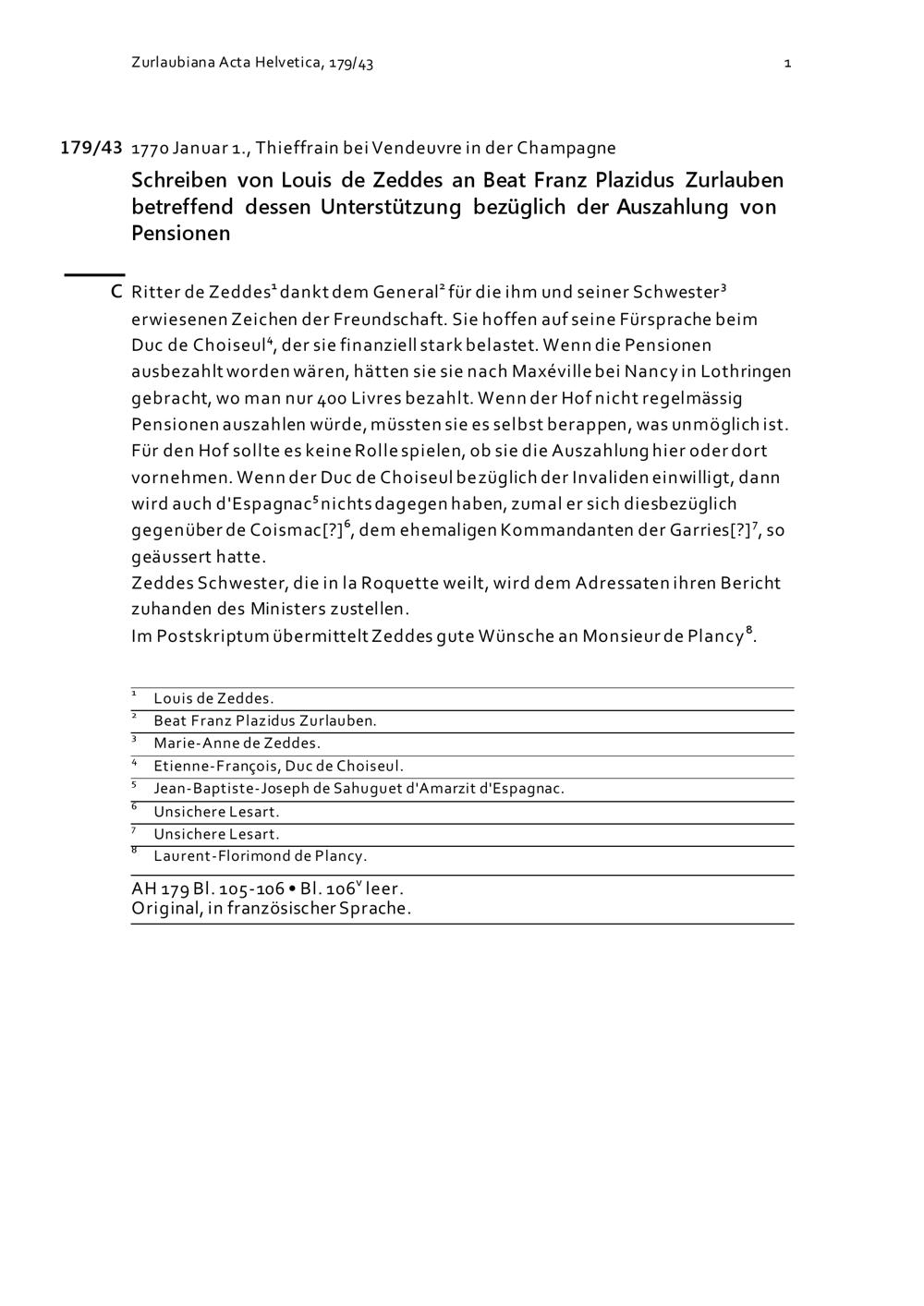 Schreiben von Louis de Zeddes an Beat Franz Plazidus Zurlauben betreffend dessen...