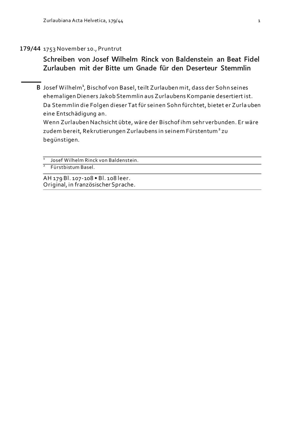 Schreiben von Josef Wilhelm Rinck von Baldenstein an Beat Fidel Zurlauben mit der Bitte um Gnade für den Deserteur Stemmlin