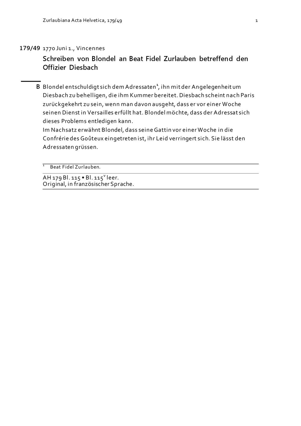 Schreiben von Blondel an Beat Fidel Zurlauben betreffend den Offizier Diesbach