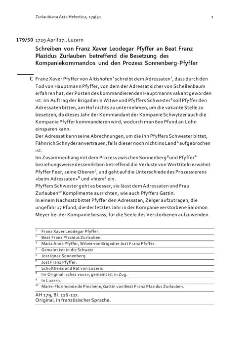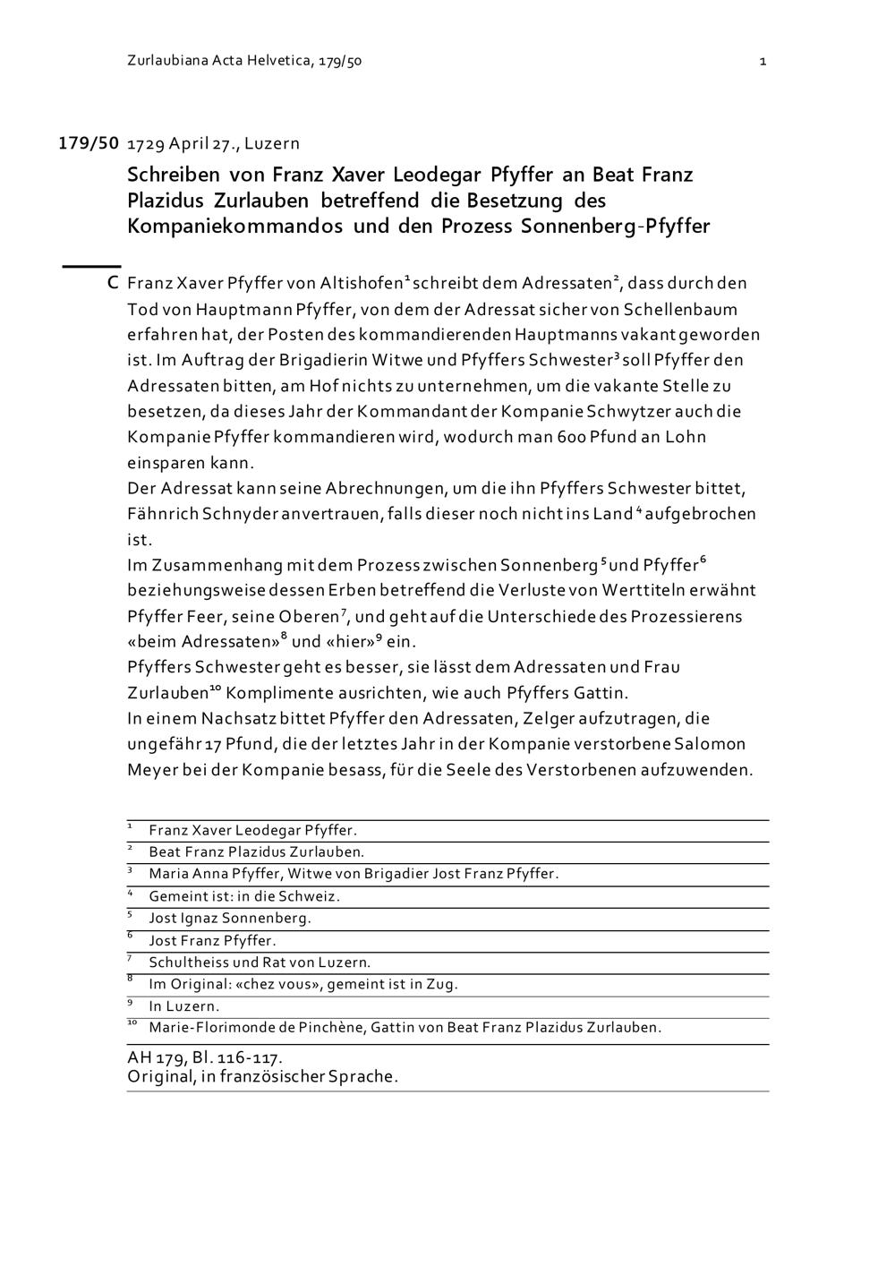Schreiben von Franz Xaver Leodegar Pfyffer an Beat Franz Plazidus Zurlauben betreffend die Besetzung des Kompaniekommandos und den Prozess Sonnenberg-Pfyffer