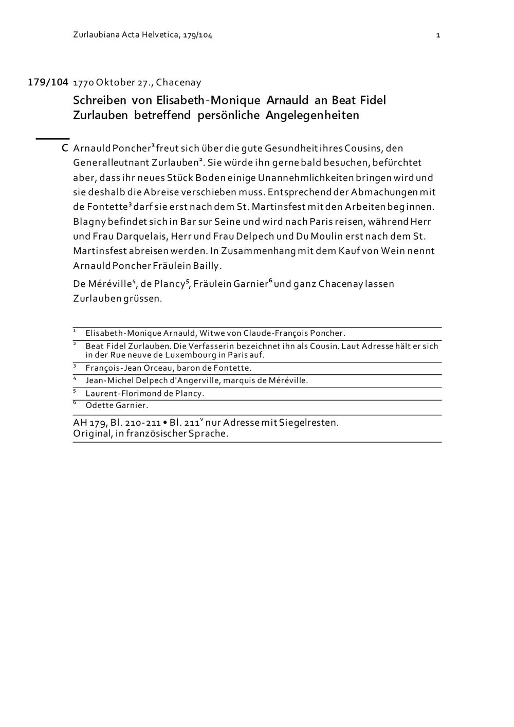 Schreiben von Elisabeth-Monique Arnauld an Beat Fidel Zurlauben betreffend persönliche...