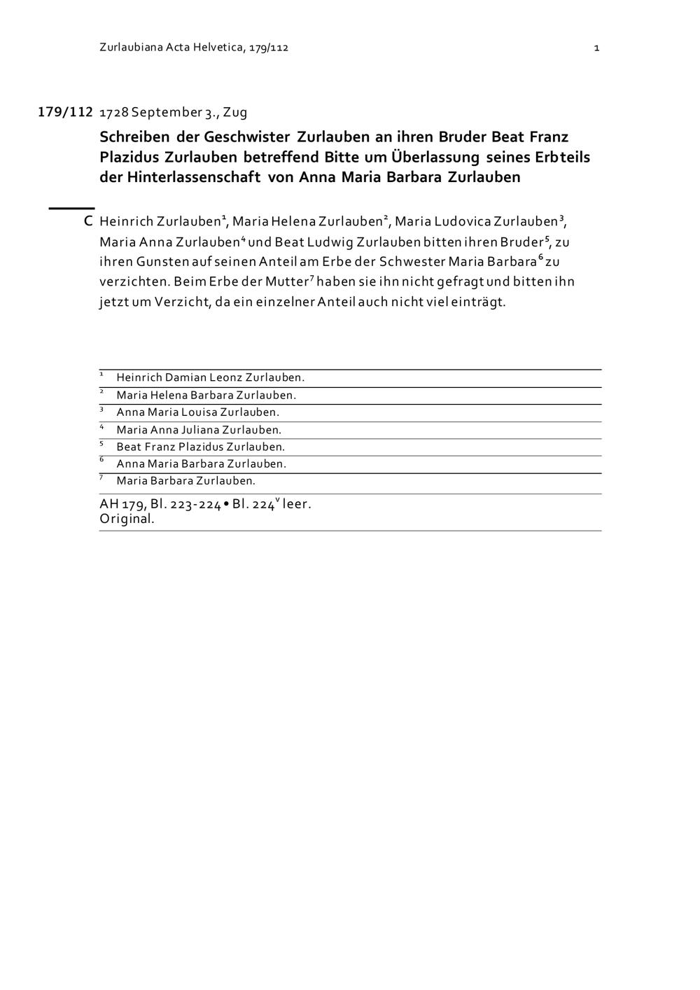 Schreiben der Geschwister Zurlauben an ihren Bruder Beat Franz Plazidus Zurlauben betreffend Bitte um Überlassung seines Erbteils der Hinterlassenschaft von Anna Maria Barbara Zurlauben