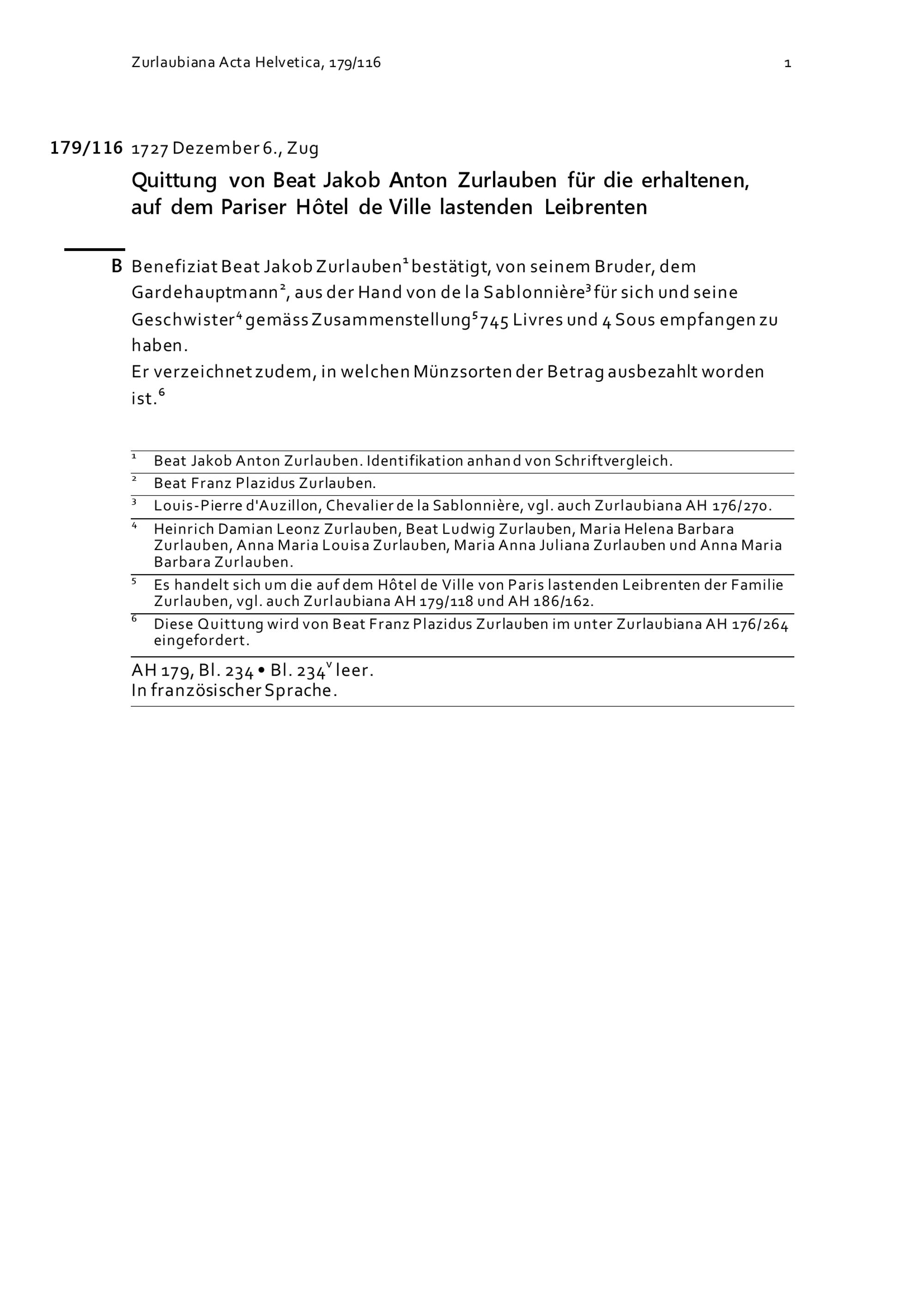 Quittung von Beat Jakob Anton Zurlauben für die erhaltenen, auf dem Pariser Hôtel de ville lastenden Leibrenten