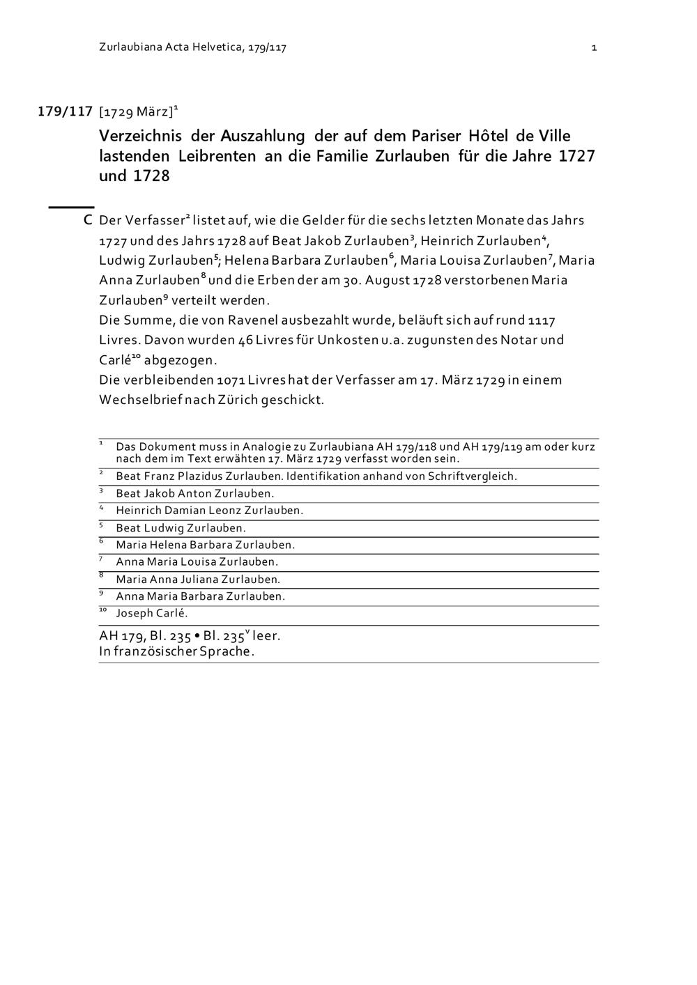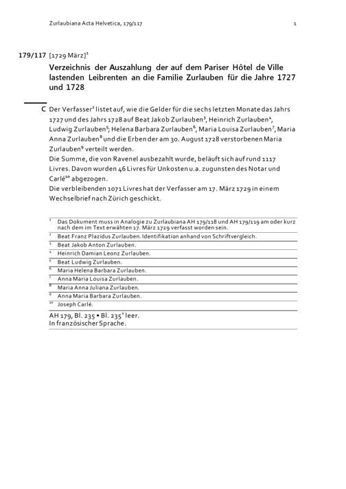 Verzeichnis der Auszahlung der auf dem Pariser Hôtel de ville lastenden Leibrenten an die Familie Zurlauben für die Jahre 1727 und 1728