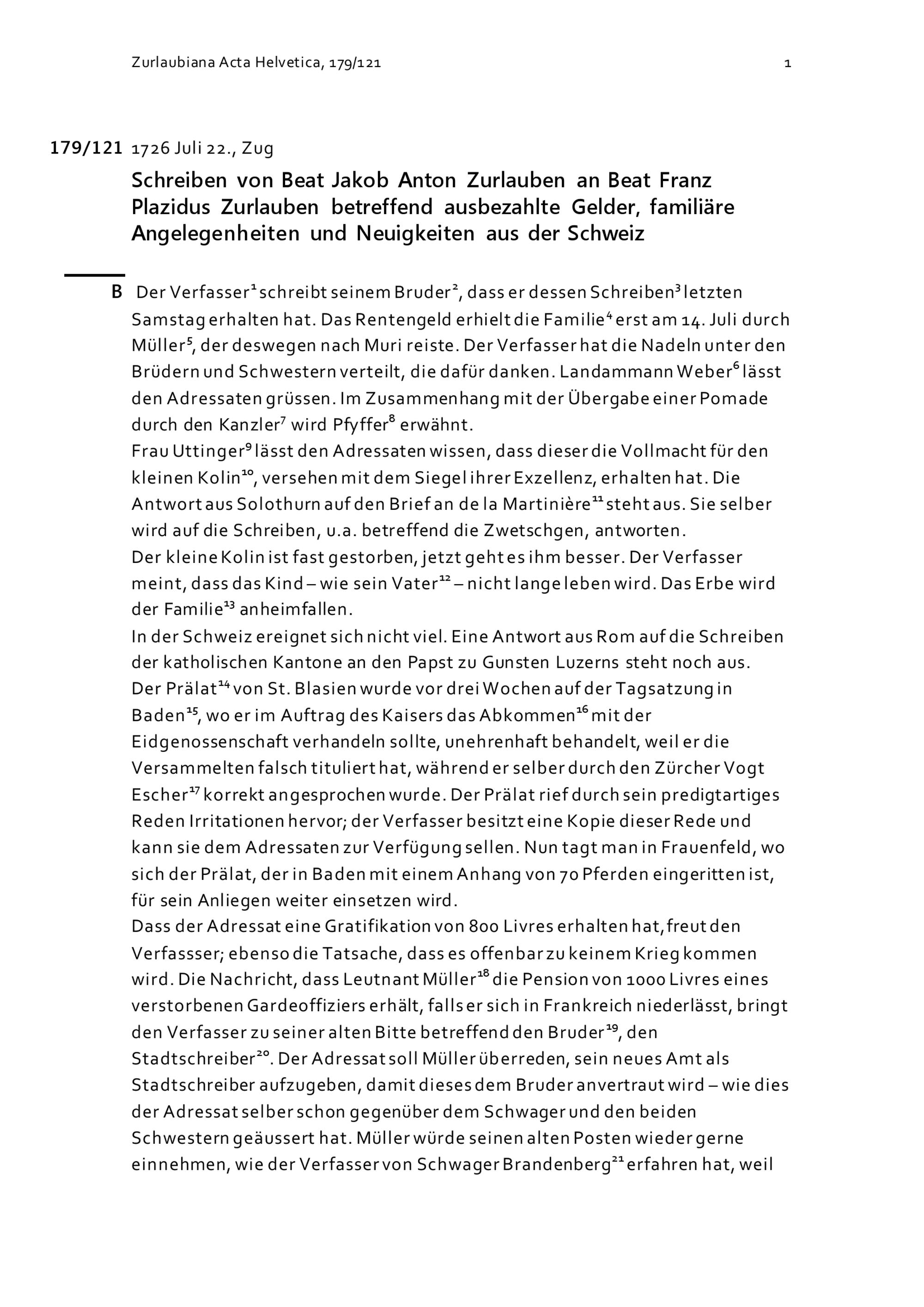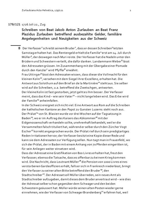 Schreiben von Beat Jakob Anton Zurlauben an Beat Franz Plazidus Zurlauben betreffend ausbezahlte Gelder, familiäre Angelegenheiten und Neuigkeiten aus der Schweiz