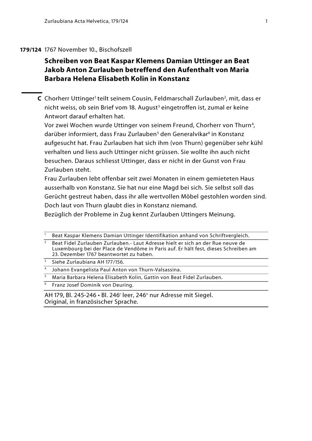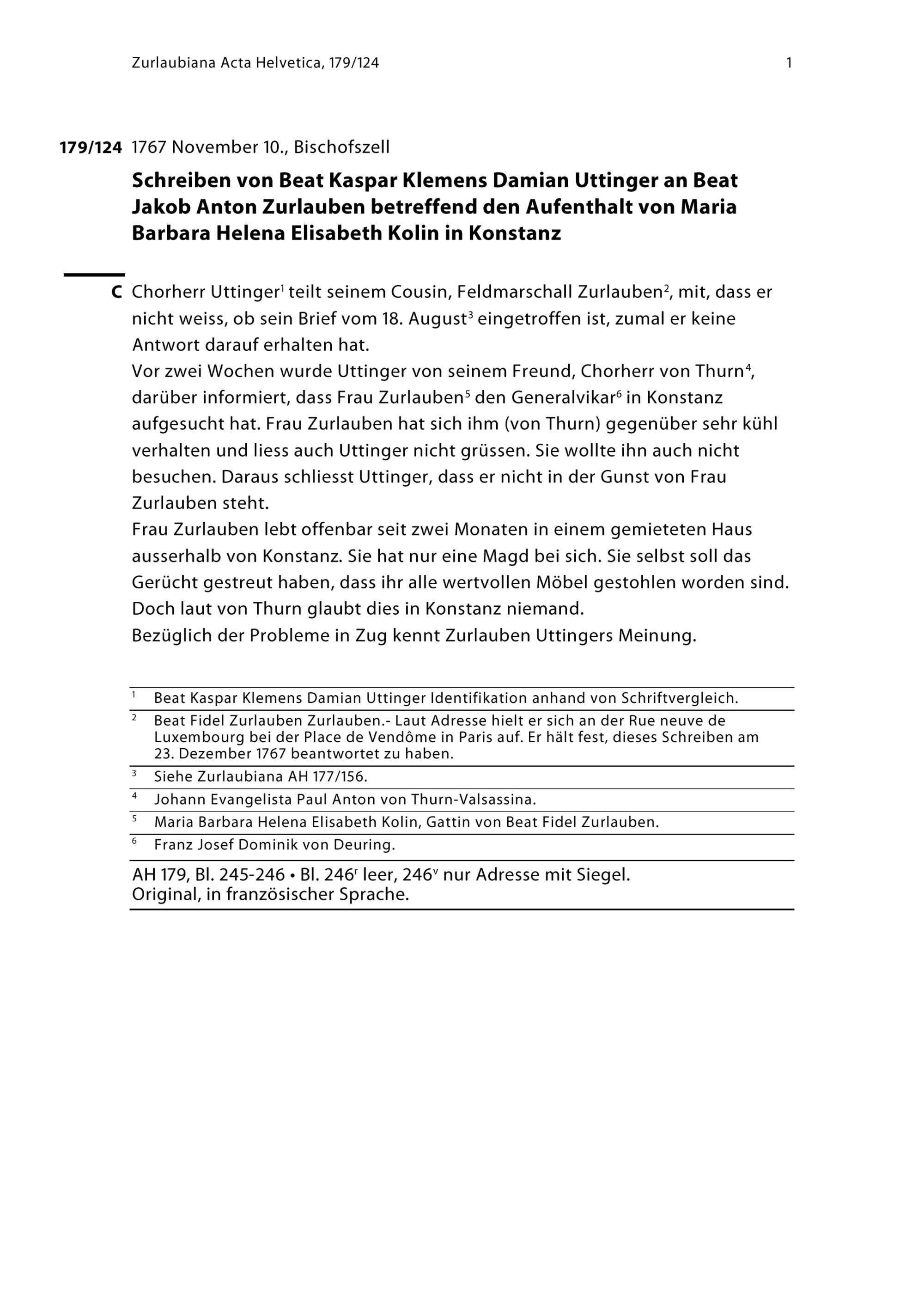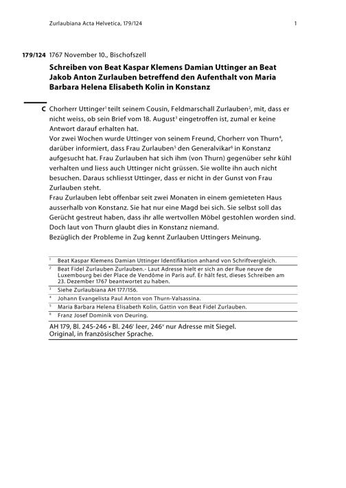 Schreiben von Beat Kaspar Klemens Damian Uttinger an Beat Jakob Anton Zurlauben betreffend den Aufenthalt von Maria Barbara Helena Elisabeth Kolin in Konstanz