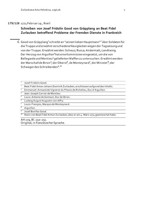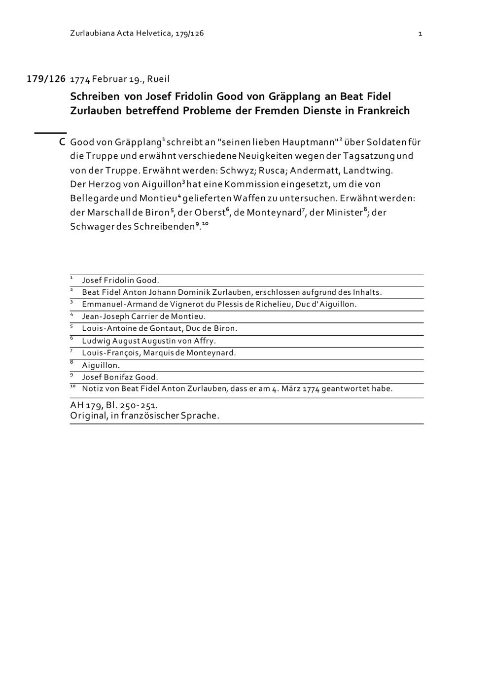 Schreiben von Josef Fridolin Good von Gräpplang an Beat Fidel Zurlauben betreffend Probleme der Fremden Dienste in Frankreich