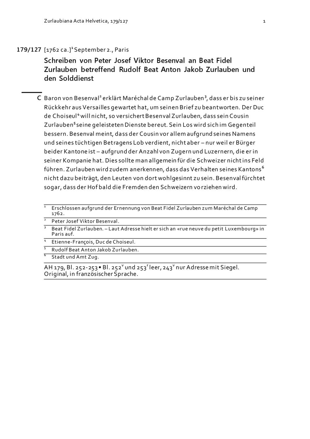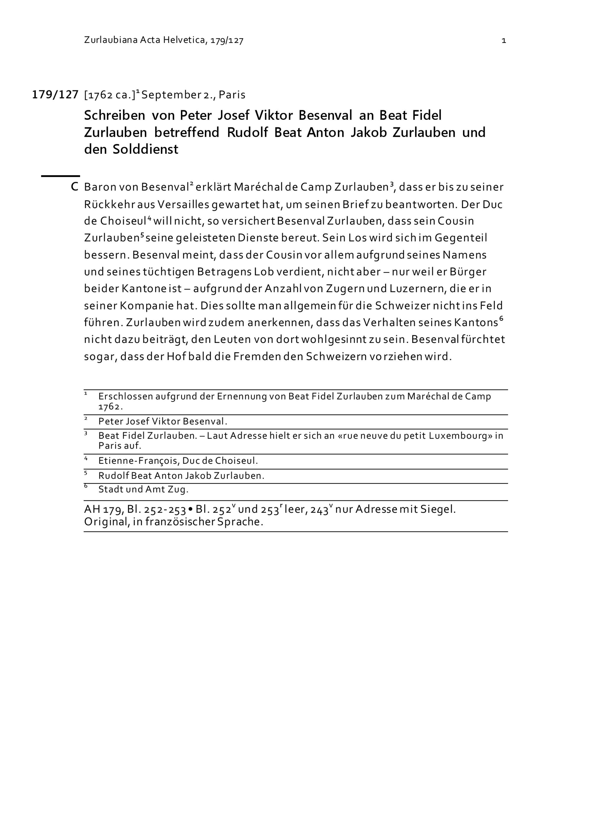 Schreiben von Peter Josef Viktor Besenval an Beat Fidel Zurlauben betreffend Rudolf...