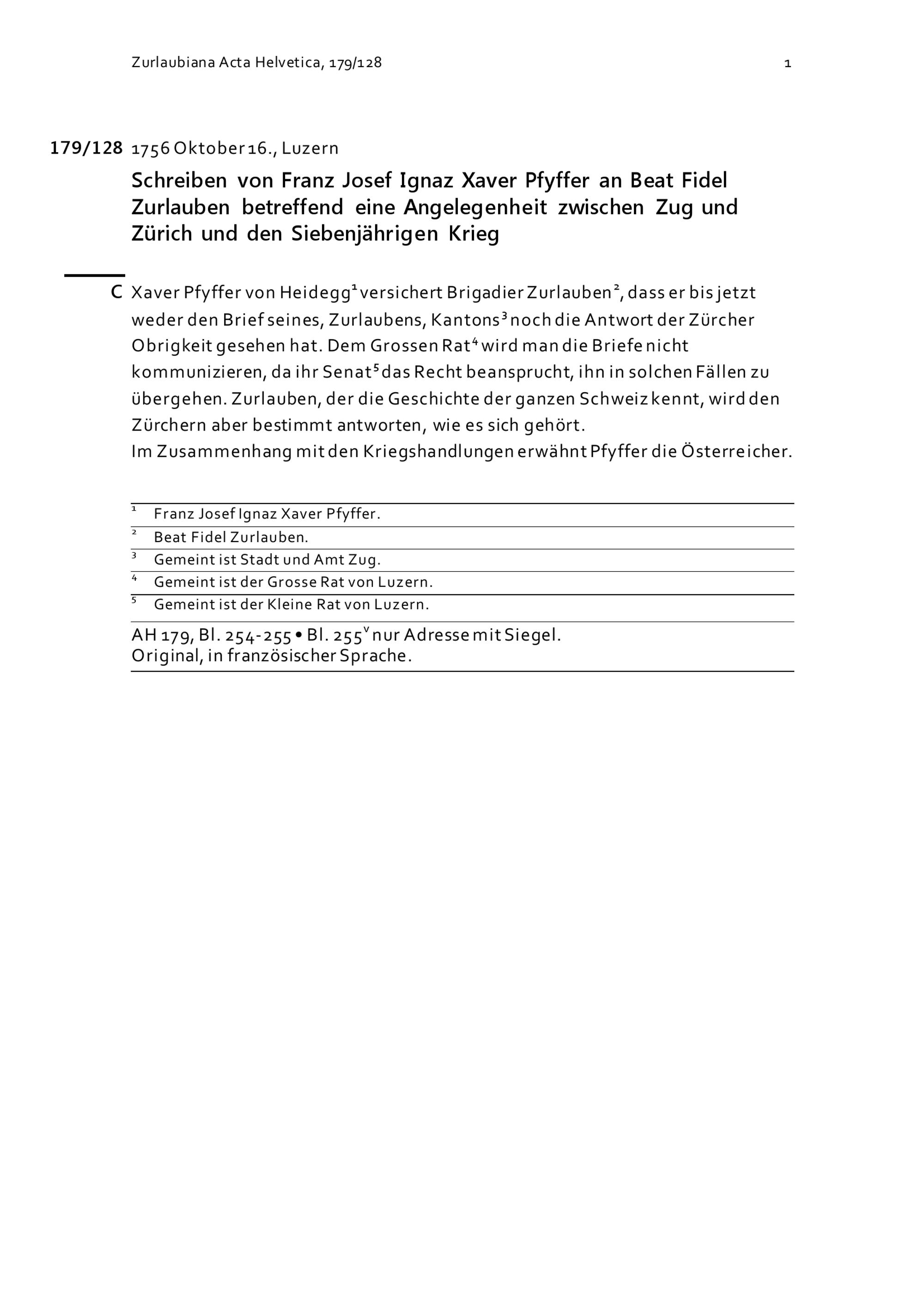 Schreiben von Franz Josef Ignaz Xaver Pfyffer an Beat Fidel Zurlauben betreffend eine Angelegenheit zwischen Zug und Zürich und den Siebenjährigen Krieg