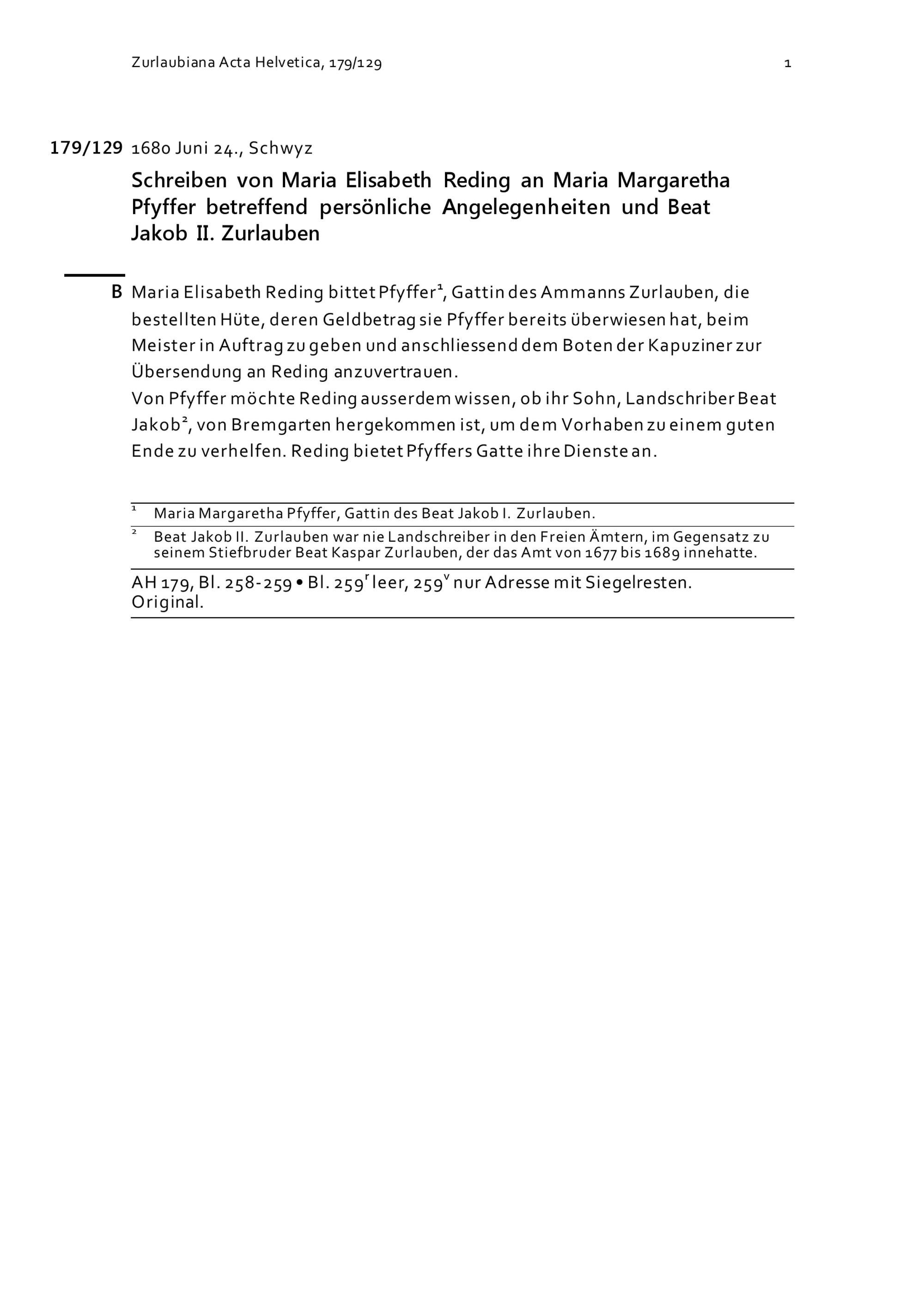 Schreiben von Maria Elisabeth Reding an Maria Margaretha Pfyffer betreffend persönliche Angelegenheiten und Beat Jakob II. Zurlauben