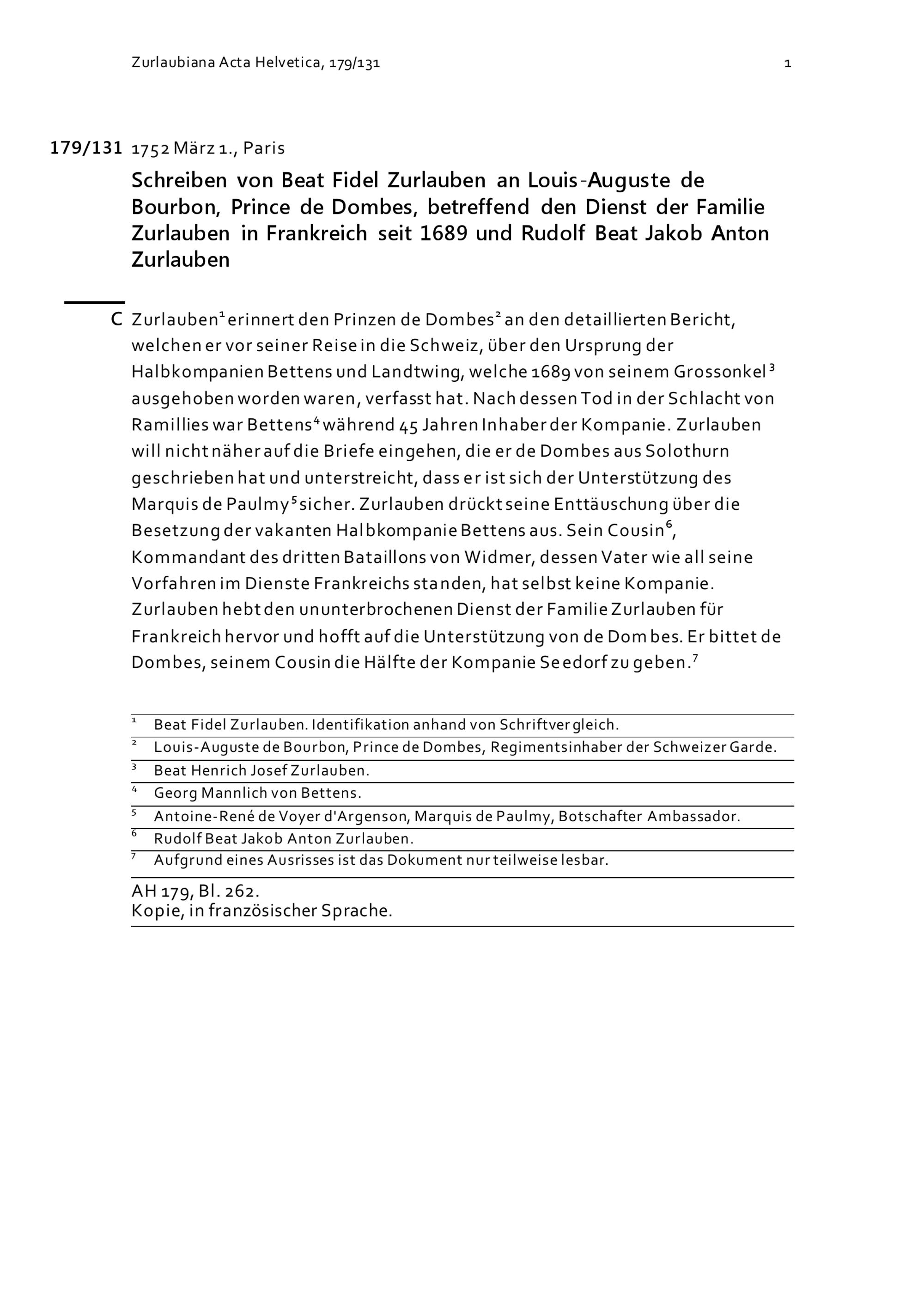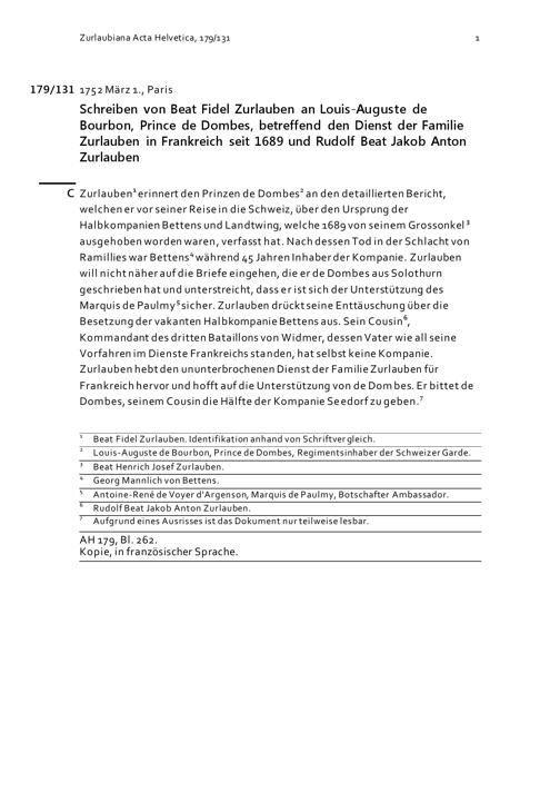 Schreiben von Beat Fidel Zurlauben an Louis-Auguste de Bourbon, Prince de Dombes betreffend den Dienst der Familie Zurlauben in Frankreich seit 1689 und Rudolf Beat Jakob Anton Zurlauben