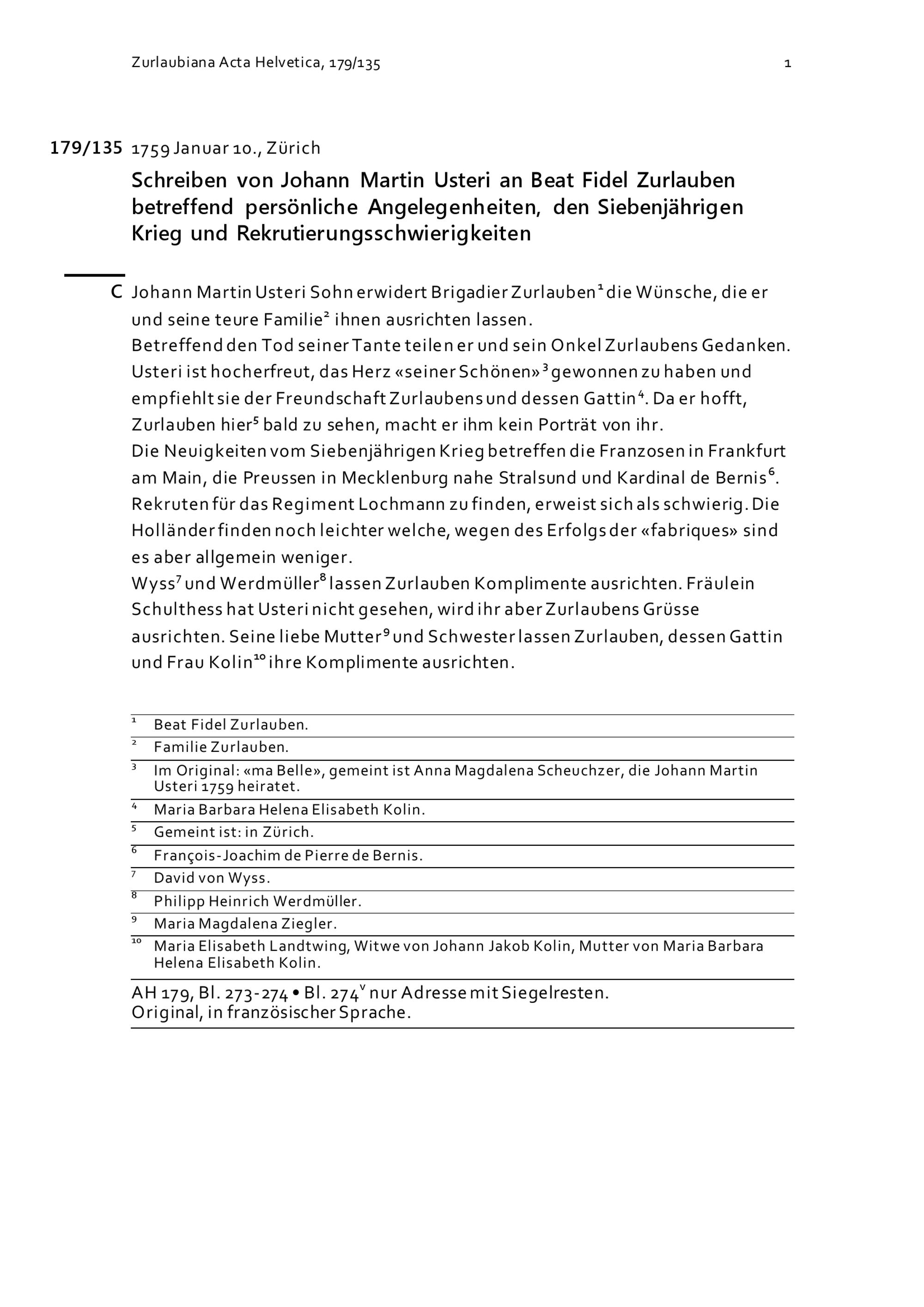 Schreiben von Johann Martin Usteri an Beat Fidel Zurlauben betreffend persönliche Angelegenheiten, den Siebenjährigen Krieg und Rekrutierungsschwierigkeiten