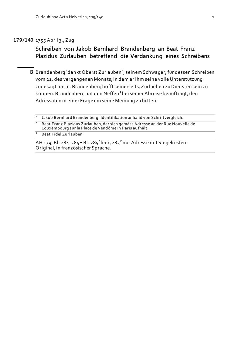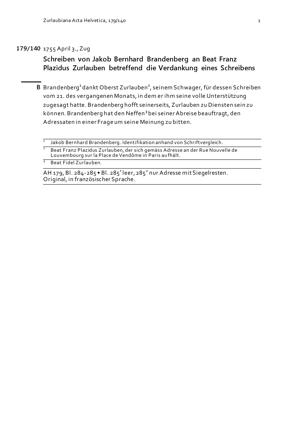 Schreiben von Jakob Bernhard Brandenberg an Beat Franz Plazidus Zurlauben betreffend...