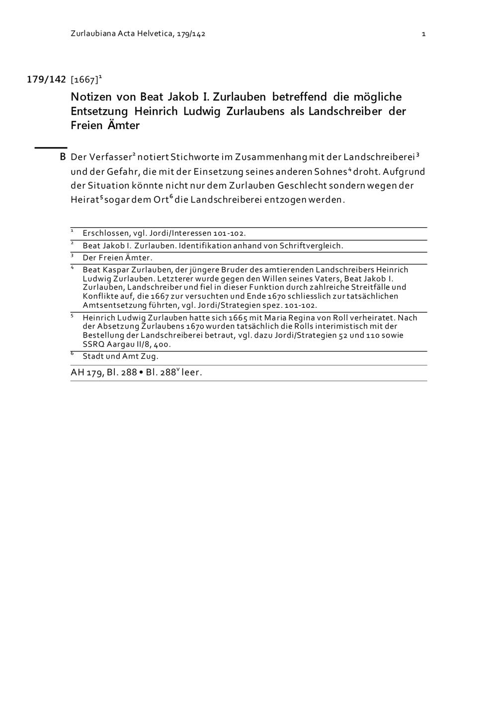 Notiz von Beat Jakob I. Zurlauben betreffend die mögliche Entsetzung Heinrich Ludwig Zurlaubens als Landschreiber der Freien Ämter