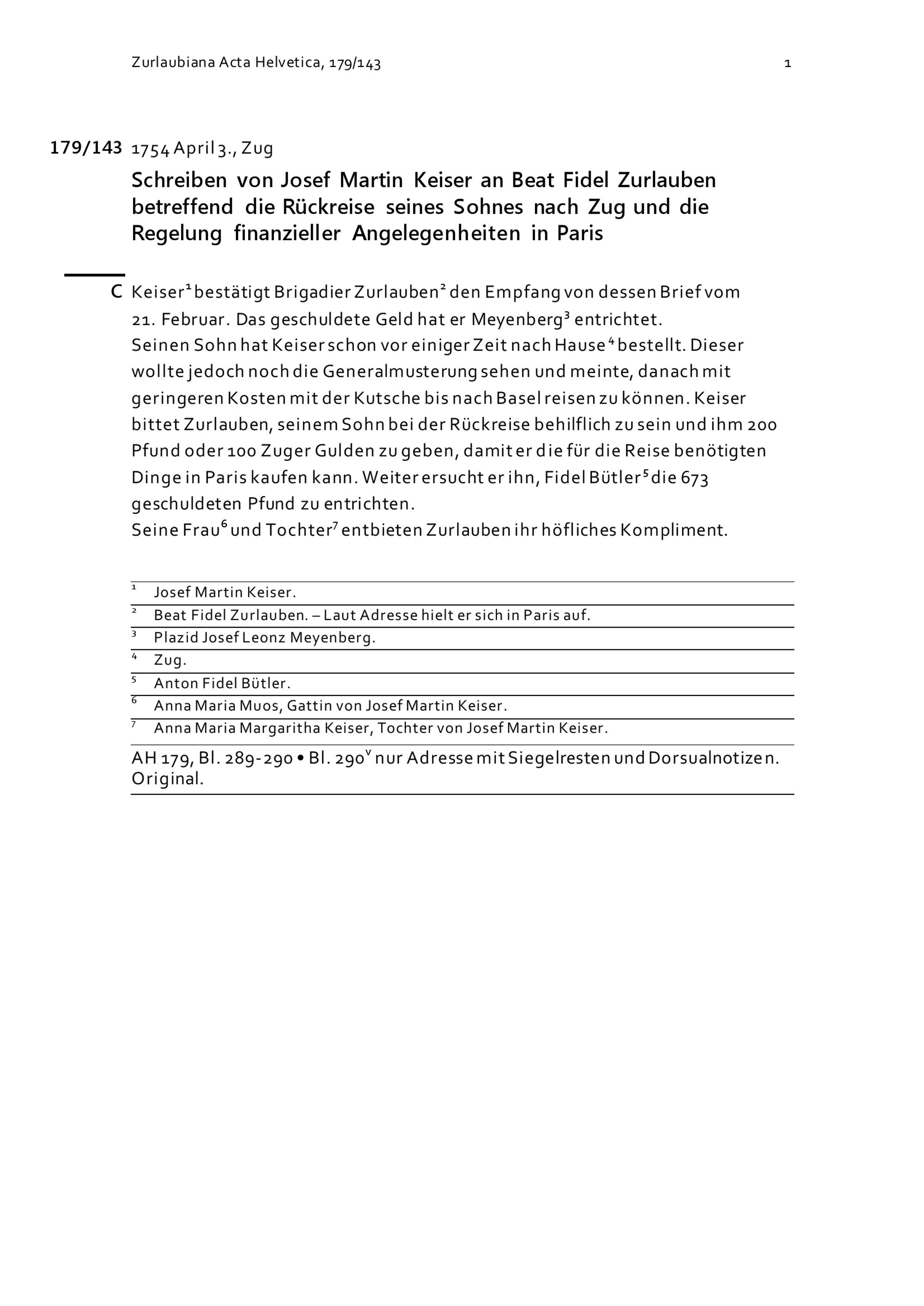 Schreiben von Josef Martin Keiser an Beat Fidel Zurlauben betreffend die Rückreise seines Sohns nach Zug und die Regelung finanzieller Angelegenheiten in Paris