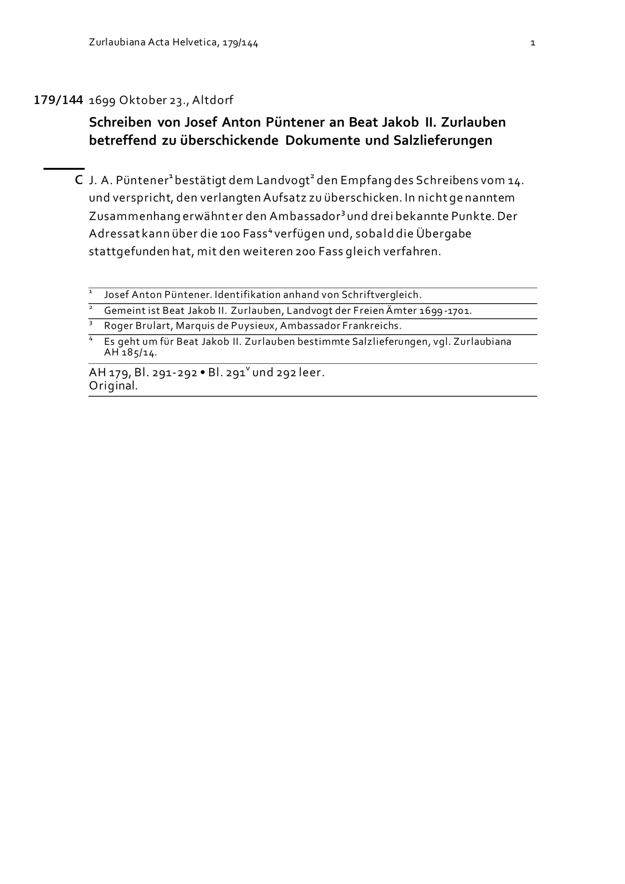 Schreiben von Josef Anton Püntener an Beat Jakob II. Zurlauben betreffend zu überschickende Dokumente und Salzlieferungen