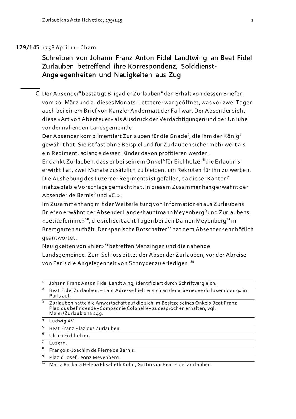 Schreiben von Johann Franz Anton Fidel Landtwing an Beat Fidel Zurlauben betreffend...