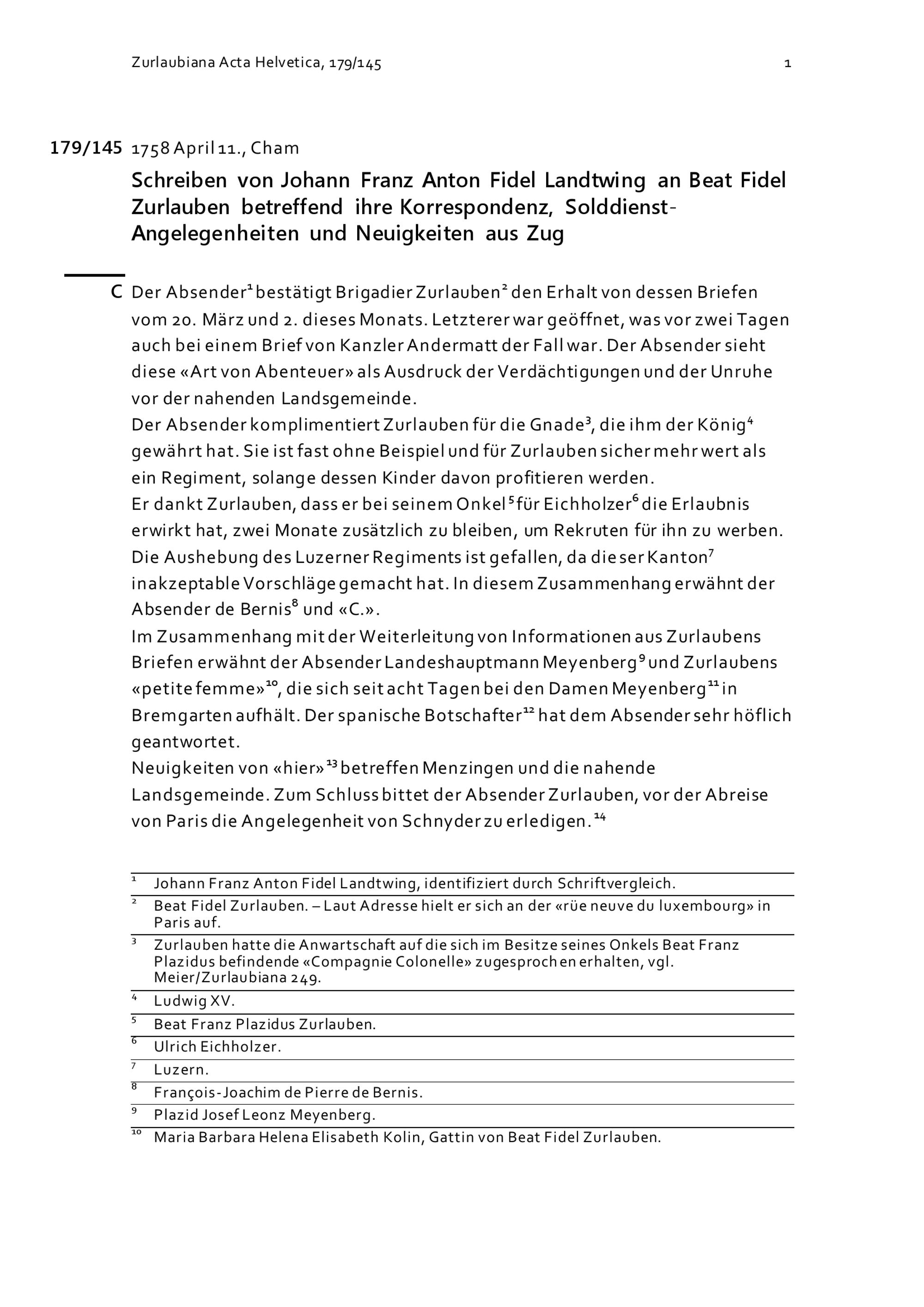 Schreiben von Johann Franz Anton Fidel Landtwing an Beat Fidel Zurlauben betreffend ihre Korrespondenz, Solddienst und Neuigkeiten aus Zug