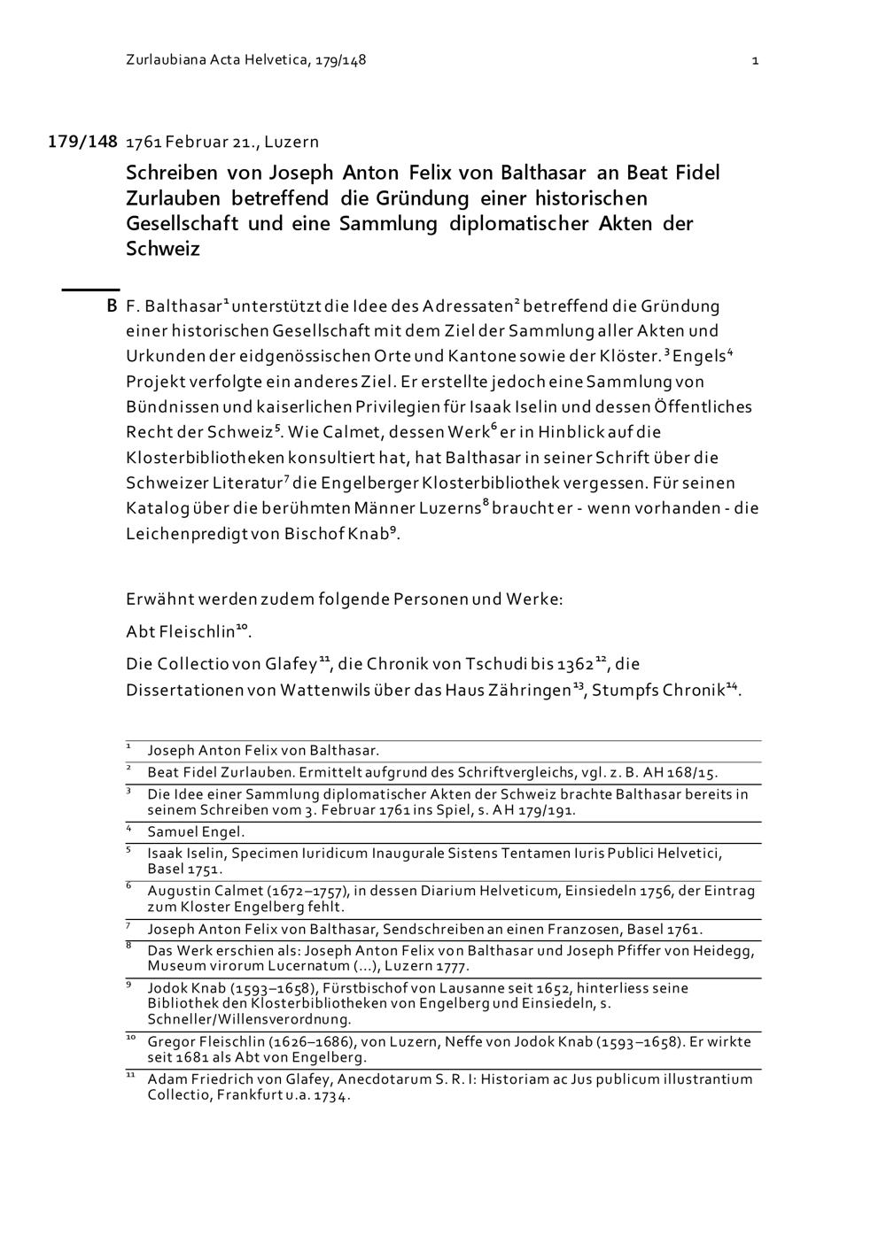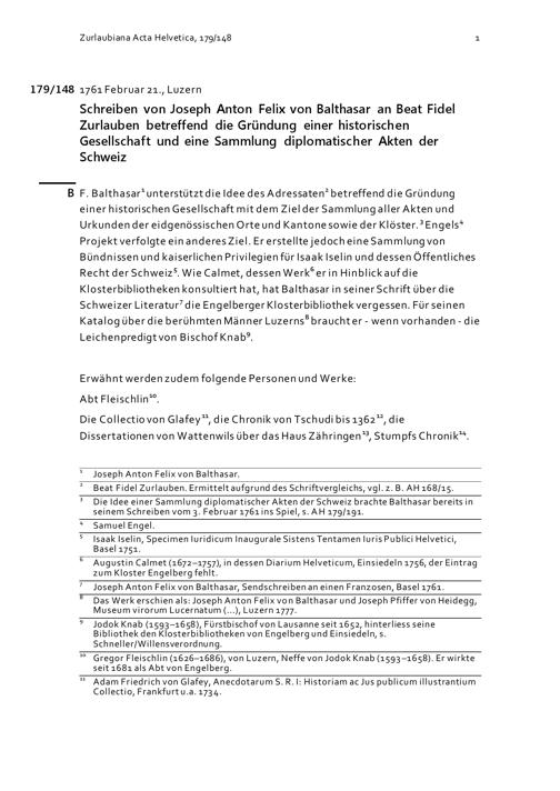 Schreiben von Joseph Anton Felix von Balthasar an Beat Fidel Zurlauben betreffend die Gründung einer historischen Gesellschaft und eine Sammlung diplomatischer Akten der Schweiz