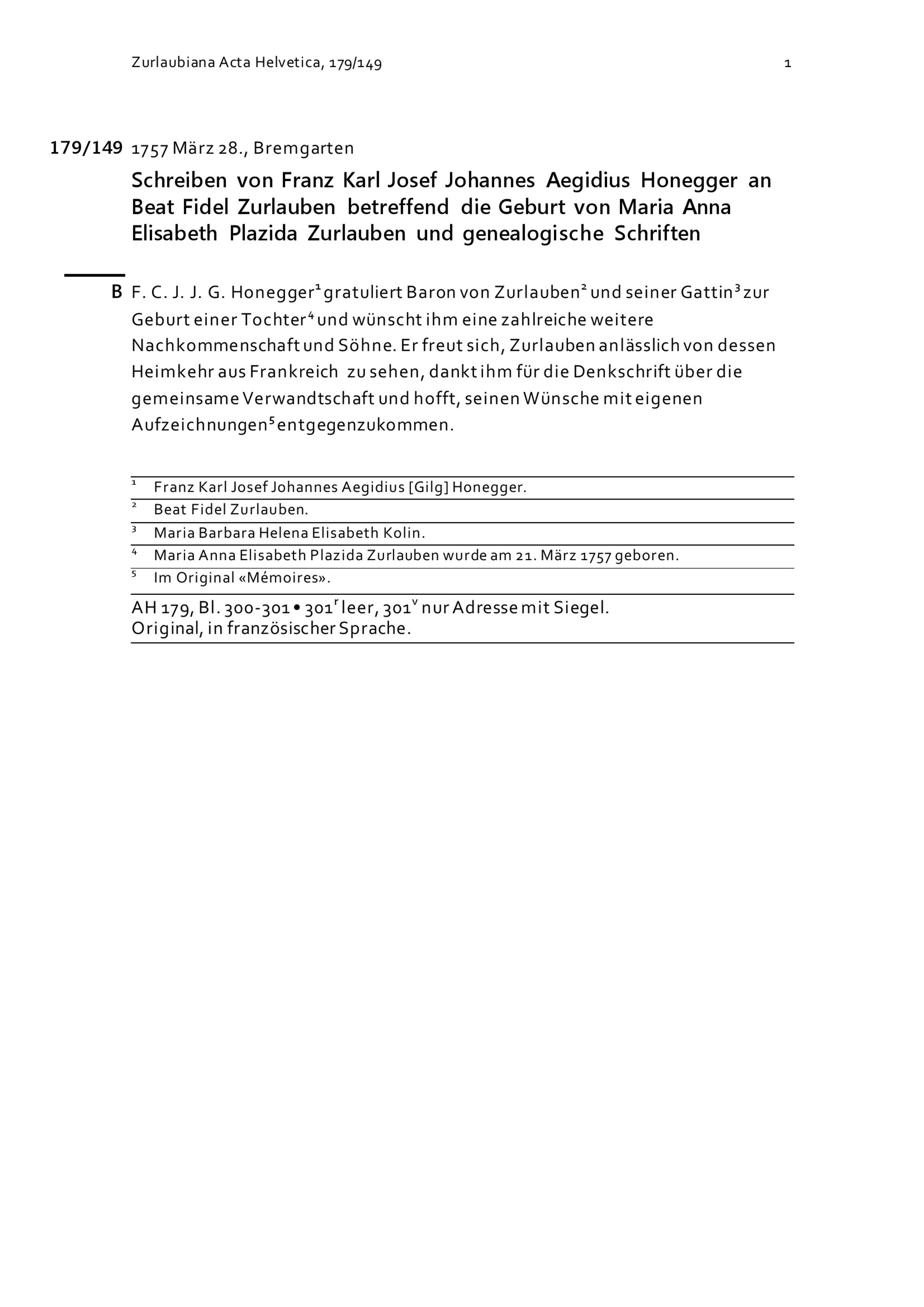 Schreiben von Franz Karl Josef Johannes Aegidius Honegger an Beat Fidel Zurlauben betreffend die Geburt von Maria Anna Elisabeth Plazida Zurlauben und genealogische Schriften