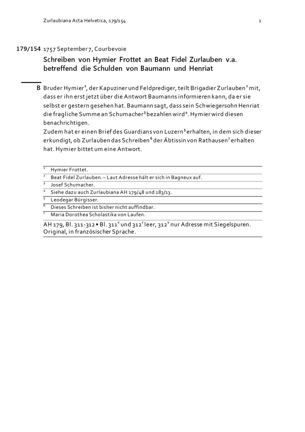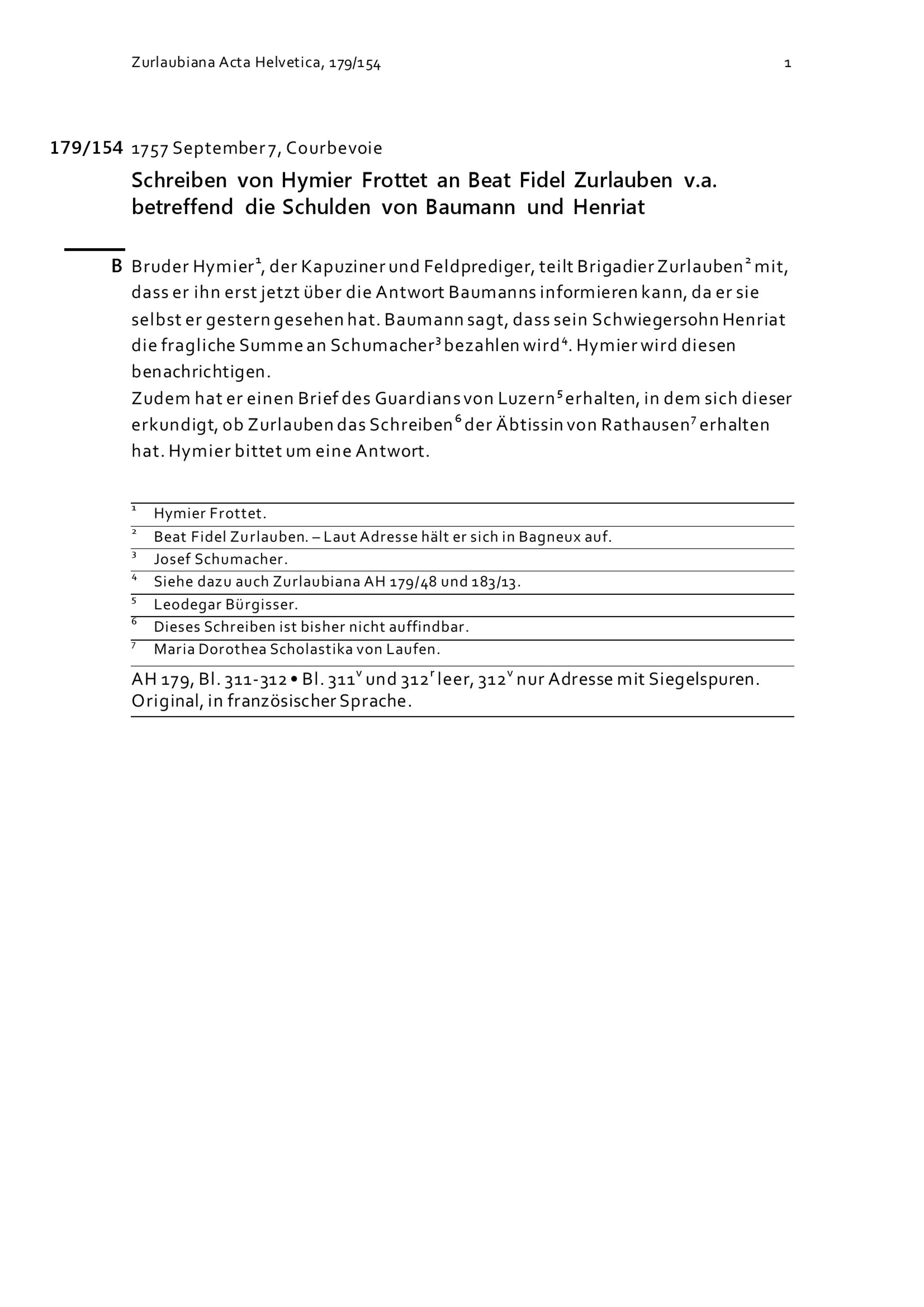 Schreiben von Hymier Frottet an Beat Fidel Zurlauben v.a. betreffend die Schulden von Baumann und Henriat