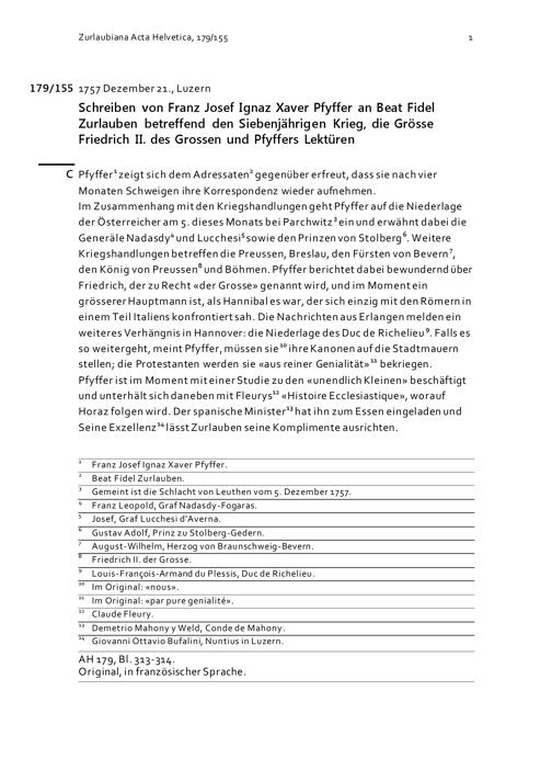 Schreiben von Franz Josef Ignaz Xaver Pfyffer an Beat Fidel Zurlauben betreffend den Siebenjährigen Krieg, die Grösse Friedrich II. des Grossen und Pfyffers Lektüren