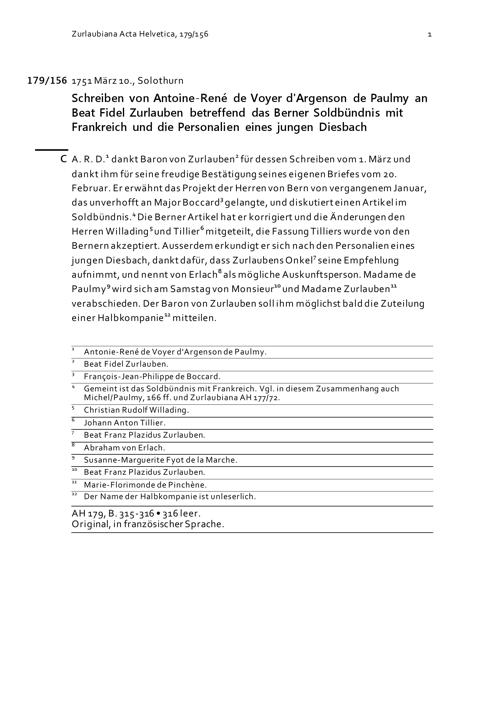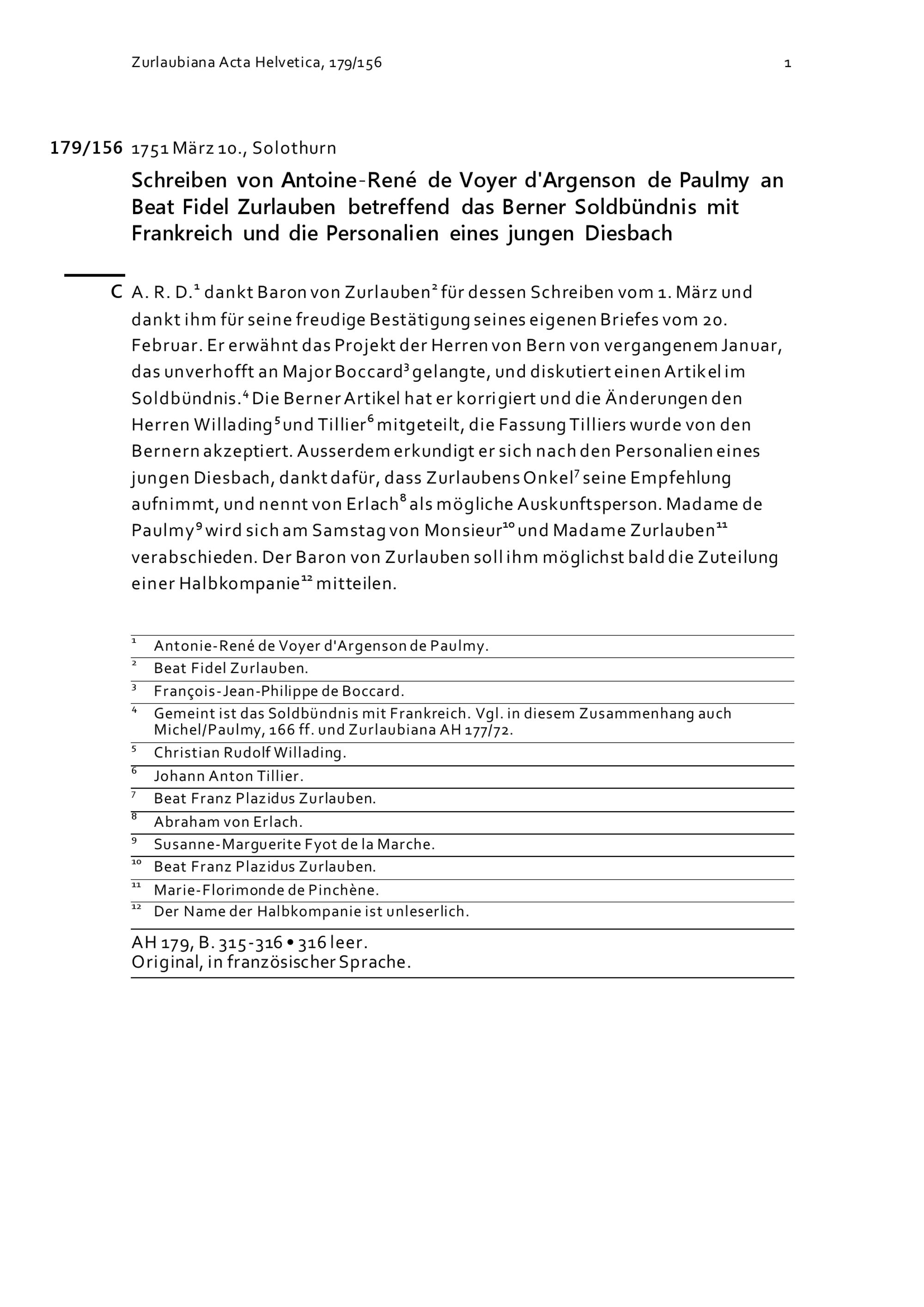 Schreiben von Antoine-René de Voyer d'Argenson de Paulmy betreffend das Berner Soldbündnis mit Frankreich und die Personalien eines jungen Diesbach