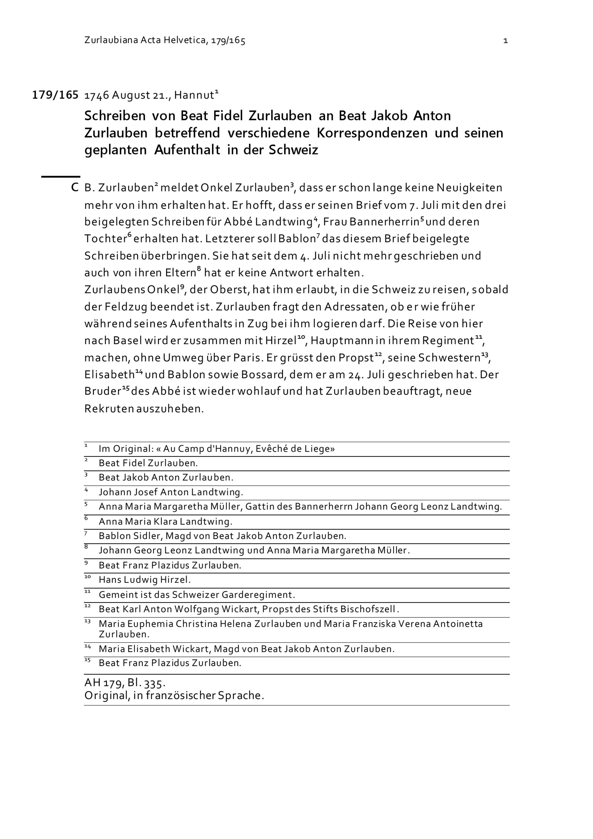 Schreiben von Beat Fidel Zurlauben an Beat Jakob Anton Zurlauben betreffend verschiedene Korrespondenzen und seinen geplanten Aufenthalt in der Schweiz
