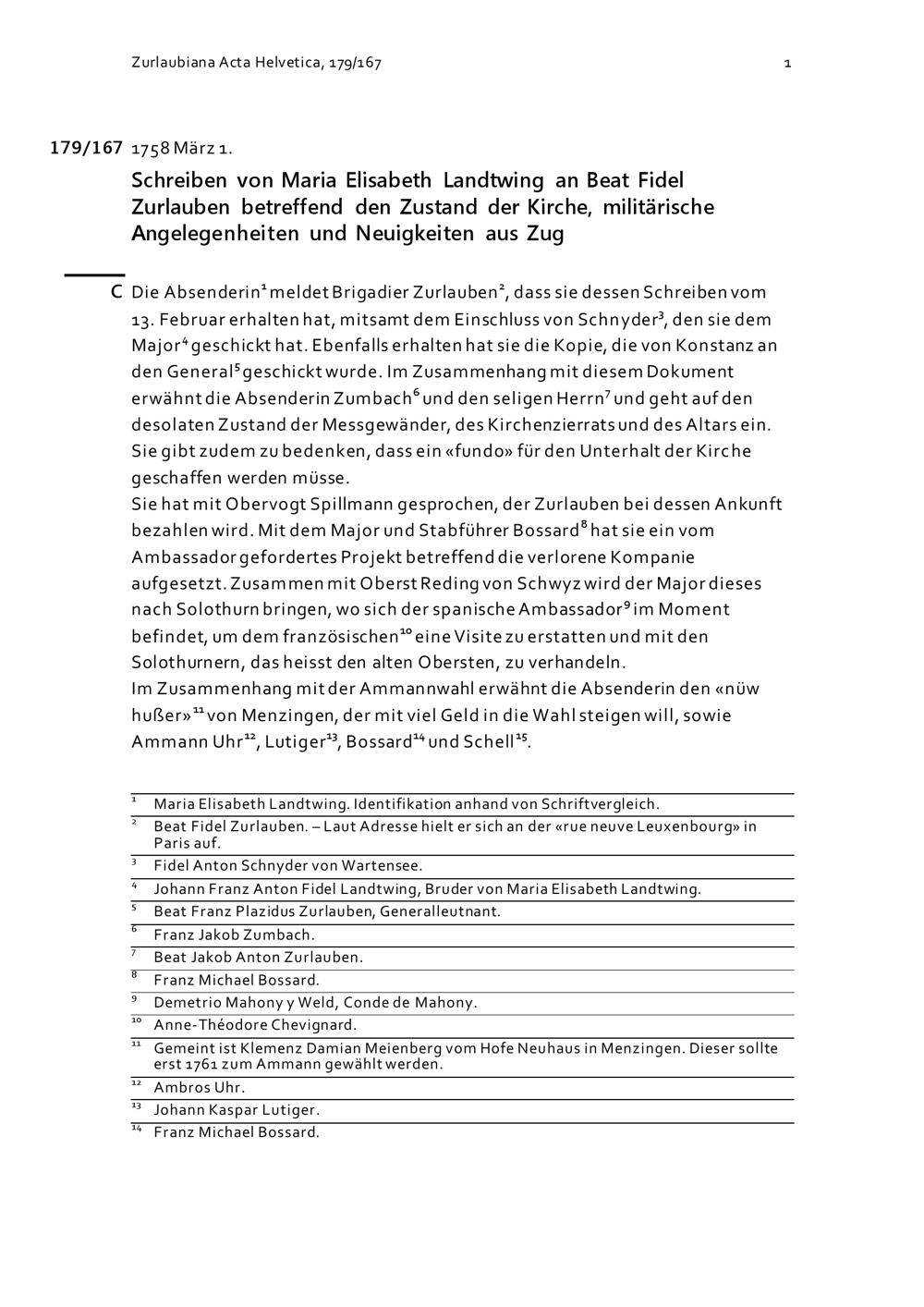 Schreiben von Maria Elisabeth Landtwing an Beat Fidel Zurlauben betreffend den Zustand der Kirche, militärische Angelegenheiten und Neuigkeiten aus Zug