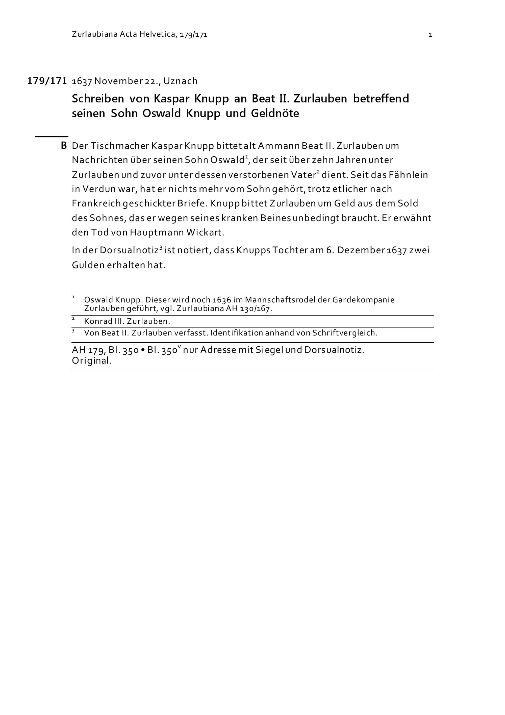Schreiben von Kaspar Knupp an Beat II. Zurlauben betreffend seinen Sohn Oswald Knupp...