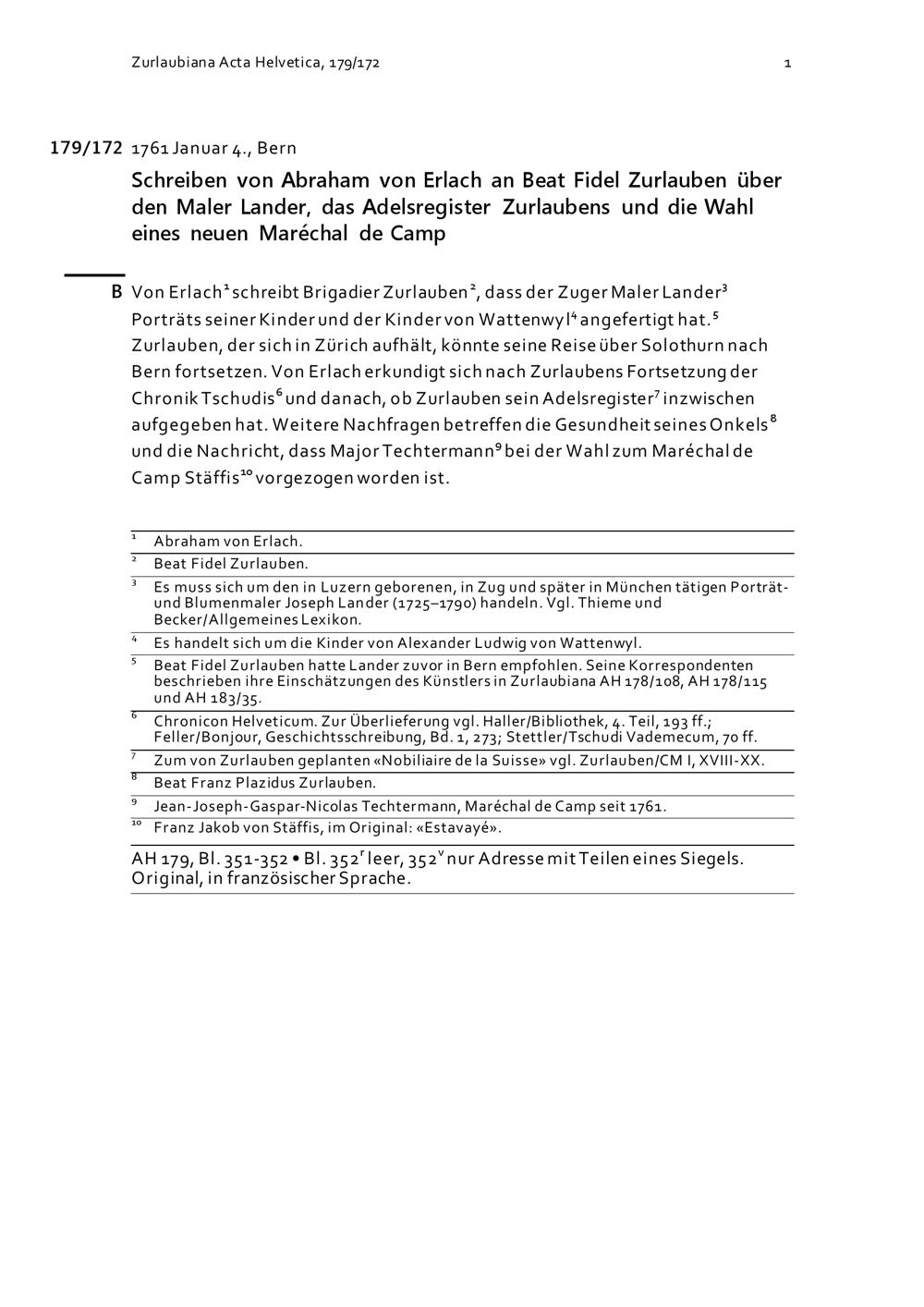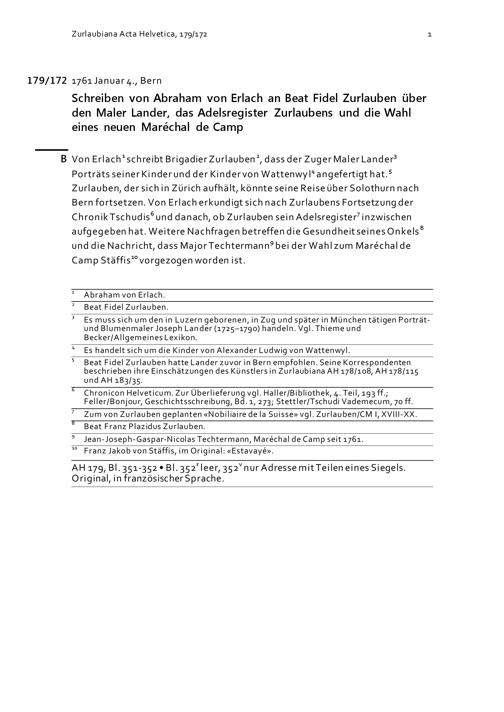 Schreiben von Abraham von Erlach an Beat Fidel Zurlauben über den Maler Lander, das...