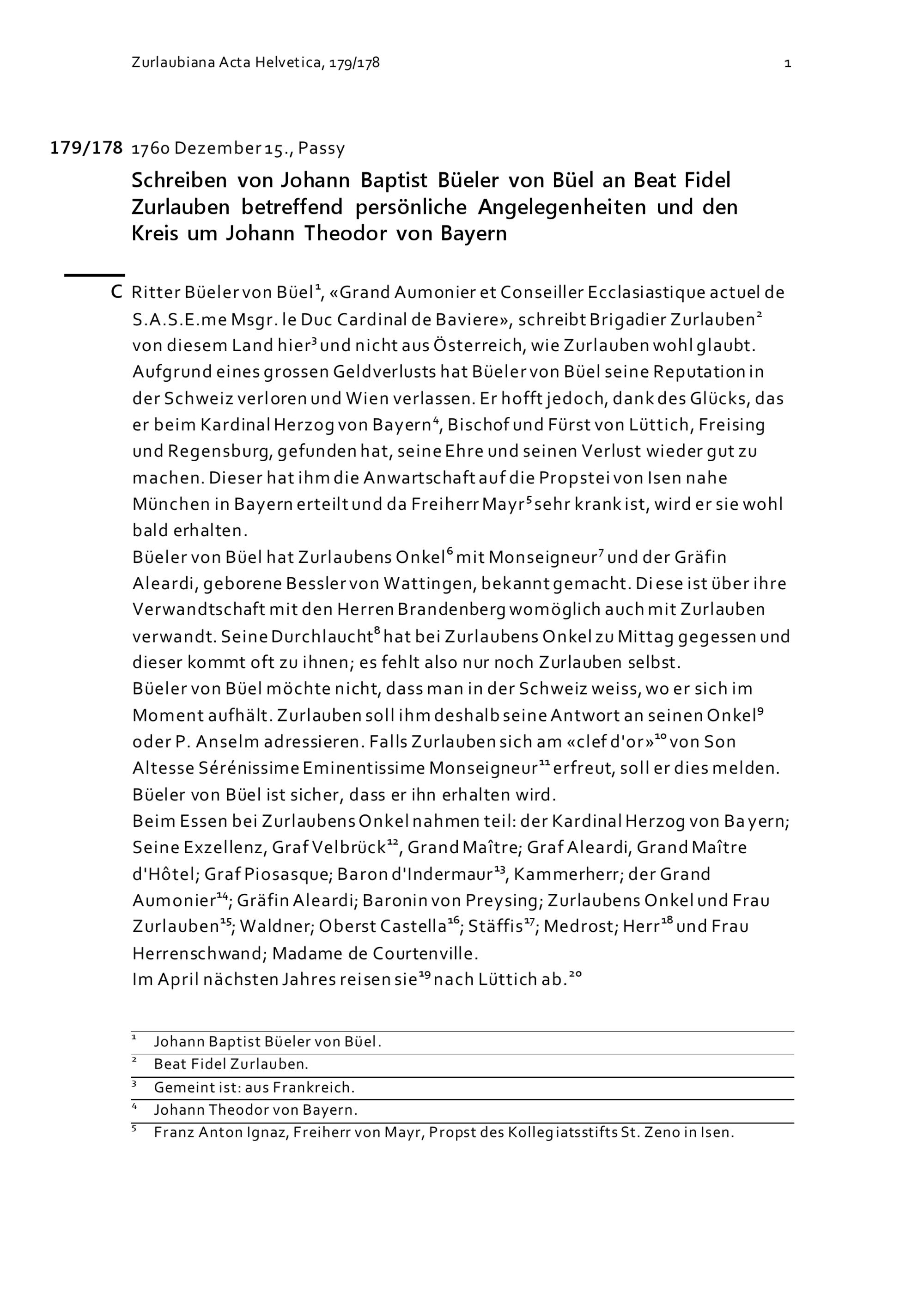 Schreiben von Johann Baptist Büeler von Büel an Beat Fidel Zurlauben betreffend persönliche Angelegenheiten und den Kreis um Johann Theodor von Bayern