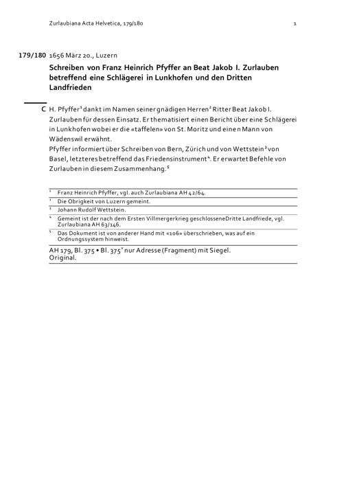 Schreiben von Franz Heinrich Pfyffer an Beat Jakob I. Zurlauben betreffend eine Schlägerei in Lunkhofen und den Dritten Landfrieden