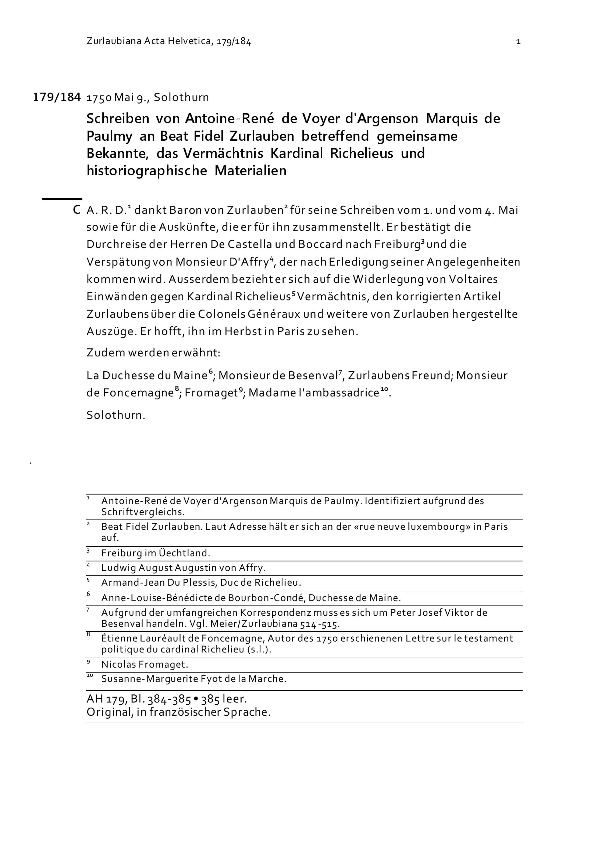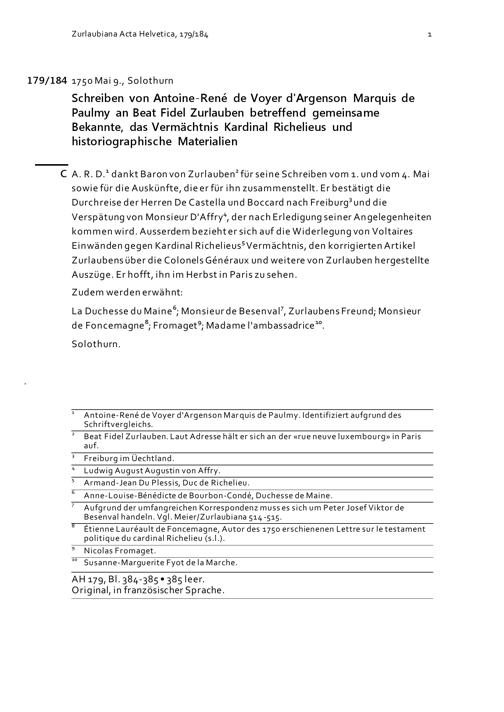 Schreiben von Antoine-René de Voyer d'Argenson, Marquis de Paulmy, an Beat Fidel Zurlauben betreffend gemeinsame Bekannte, das Vermächtnis Kardinal Richelieus und historiografische Materialien