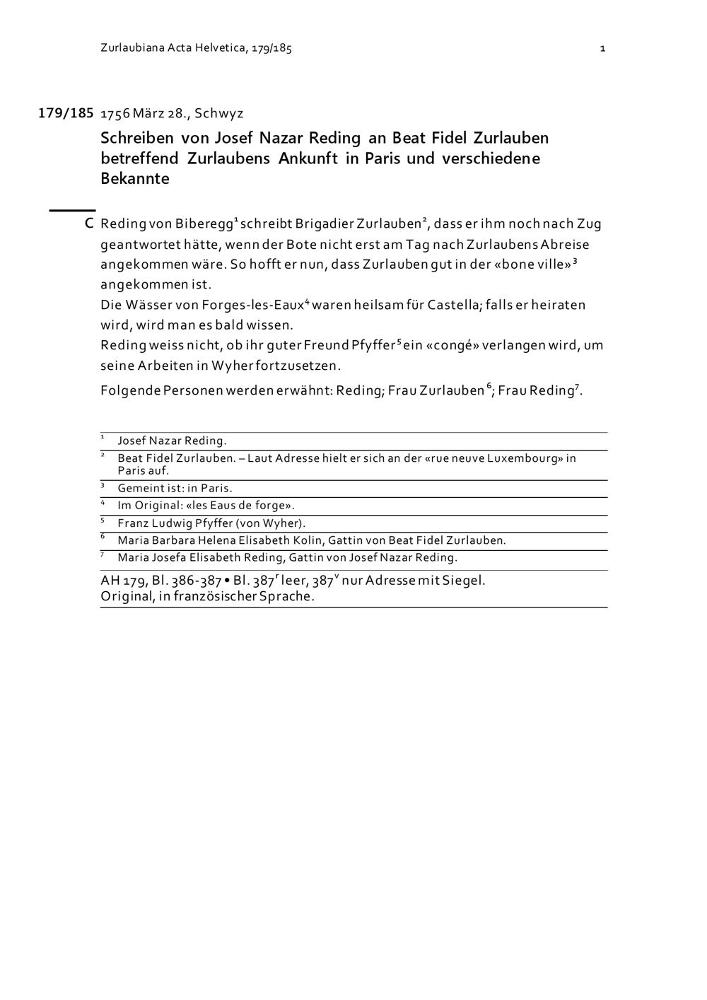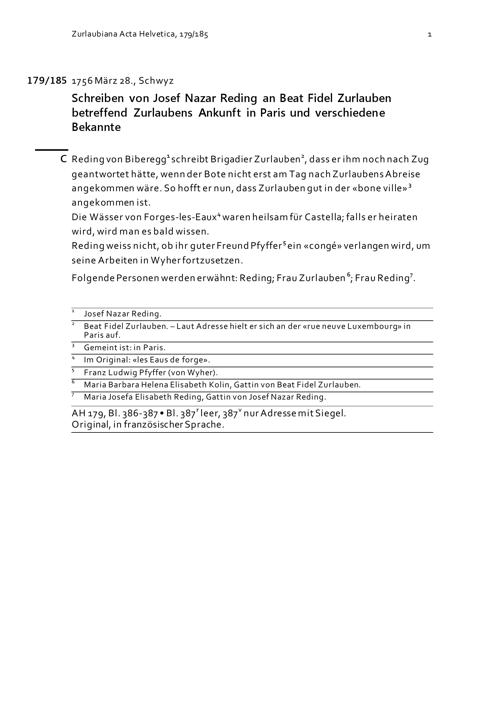Schreiben von Josef Nazar Reding an Beat Fidel Zurlauben betreffend Zurlaubens Ankunft in Paris und verschiedene Bekannte