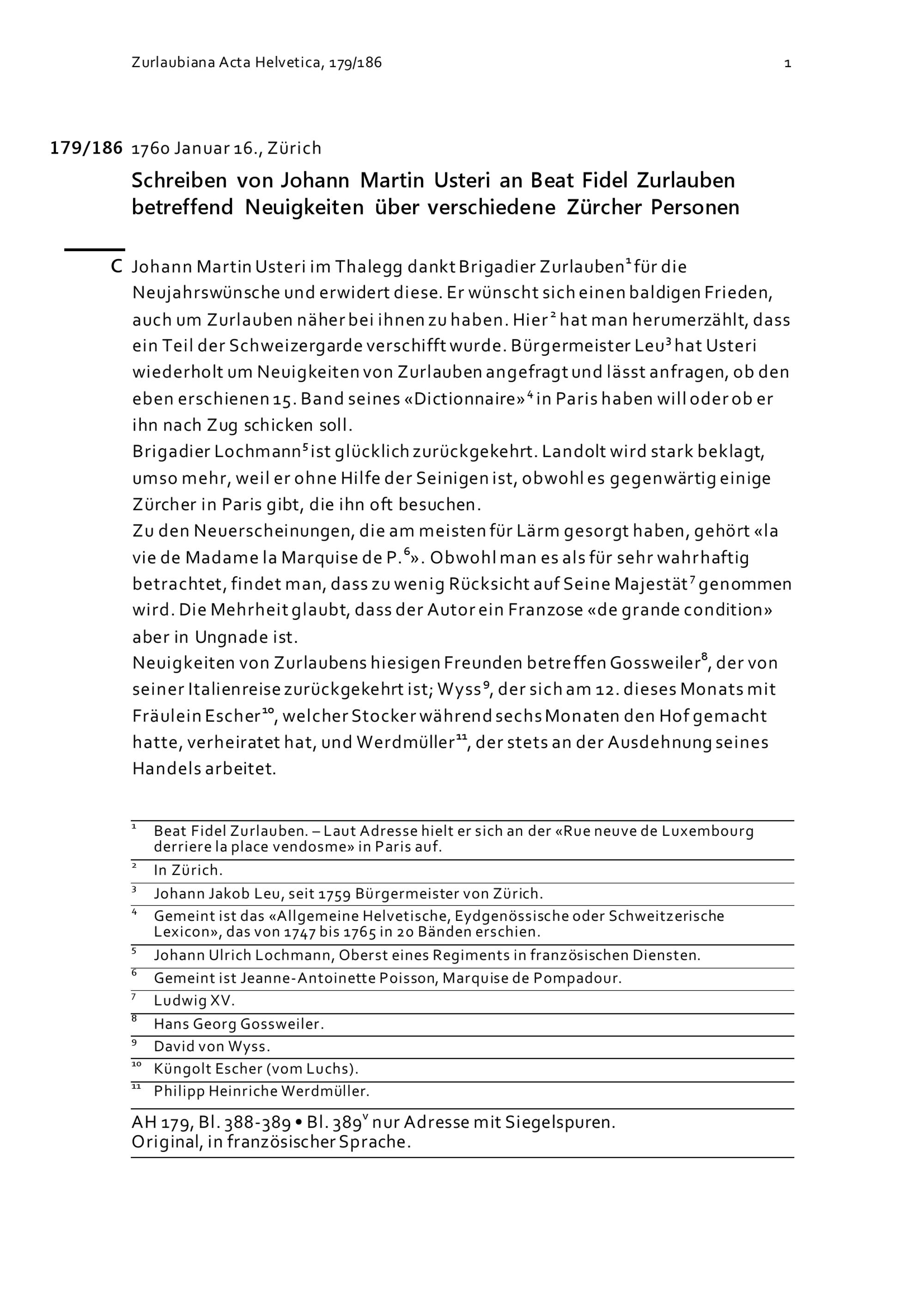 Schreiben von Johann Martin Usteri an Beat Fidel Zurlauben betreffend Neuigkeiten über verschiedene Zürcher Personen
