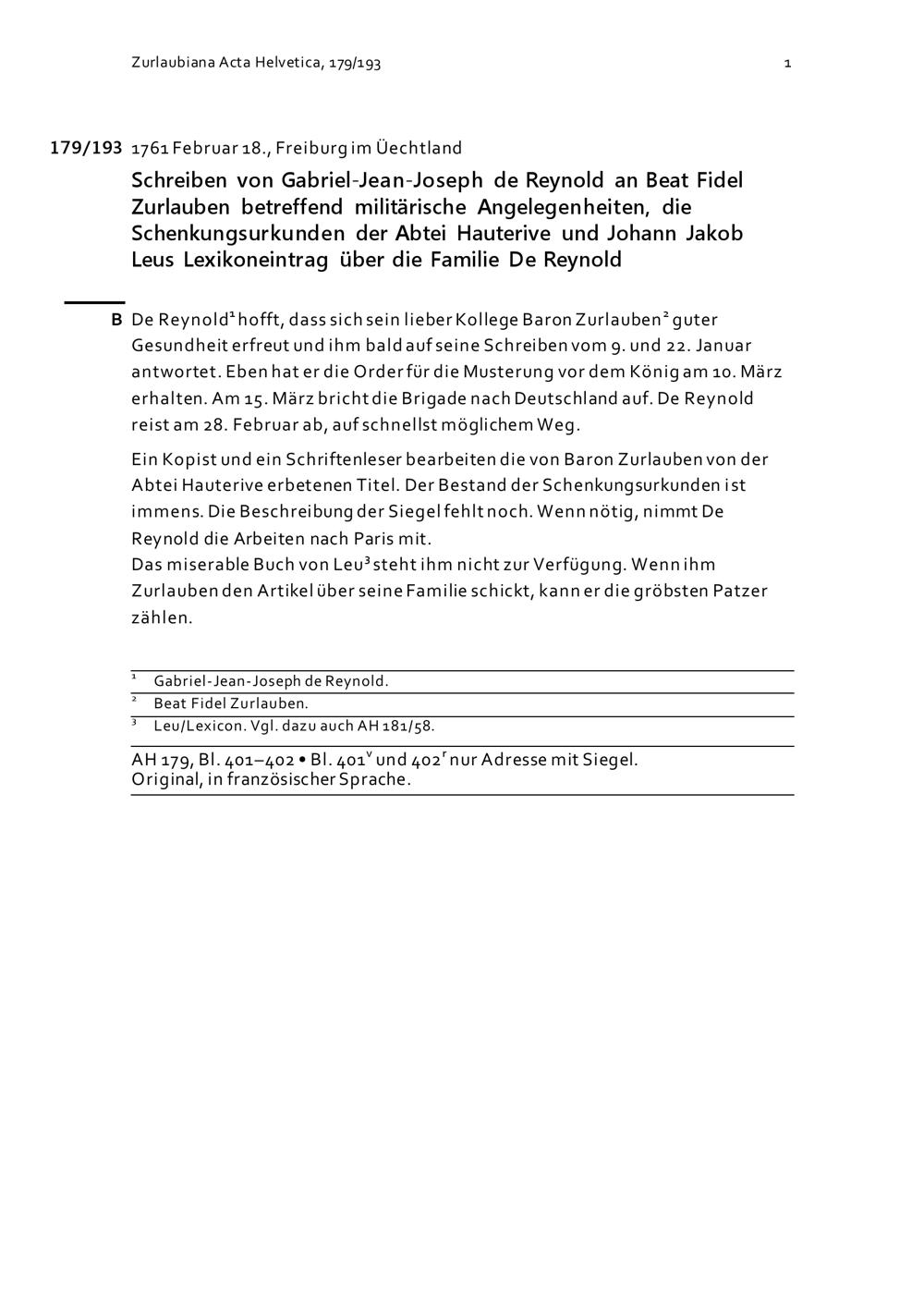 Schreiben von Gabriel-Jean-Joseph de Reynold an Beat Fidel Zurlauben betreffend militärische Angelegenheiten, die Schenkungsurkunden der Abtei Hauterive und Johann Jakob Leus Lexikoneintrag über die Familie De Reynold