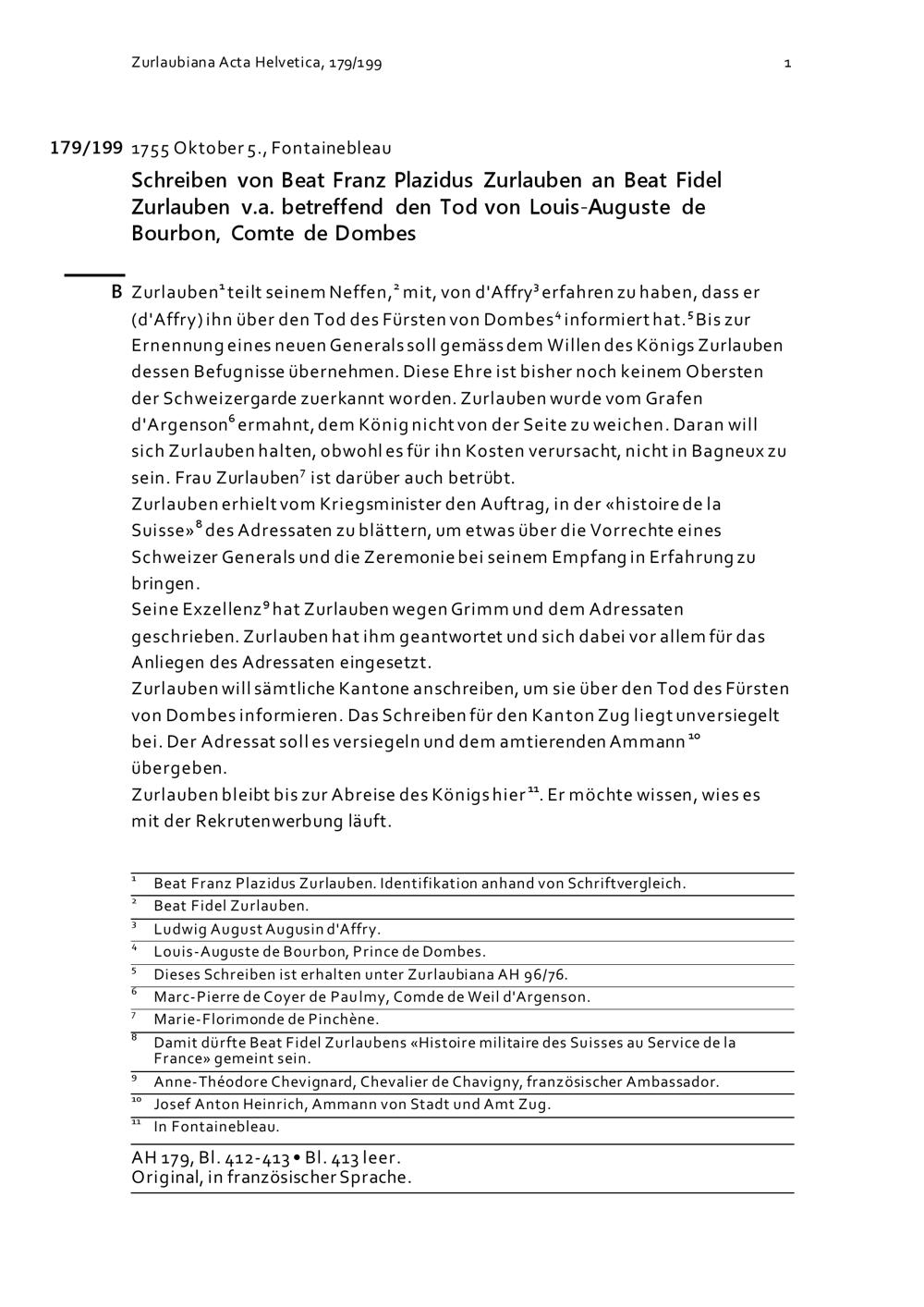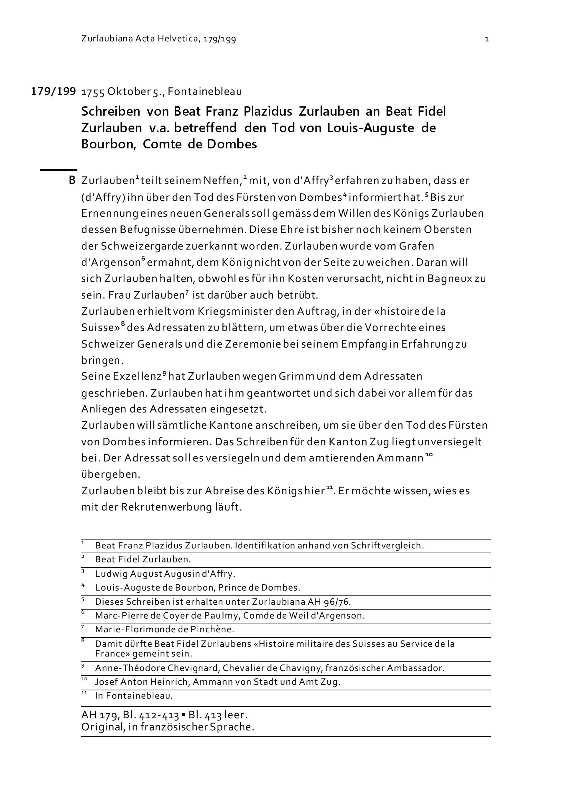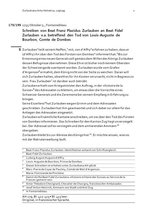 Schreiben von Beat Franz Plazidus Zurlauben an Beat Fidel Zurlauben v.a. betreffend den Tod von Louis-Auguste de Bourbon, Comte de Dombes