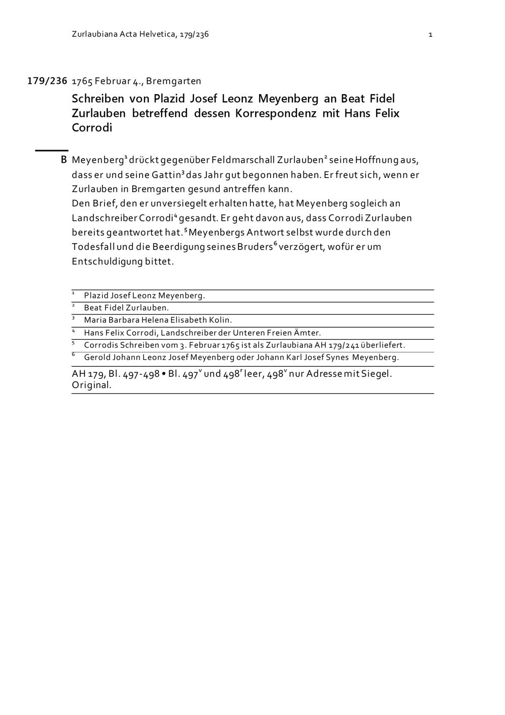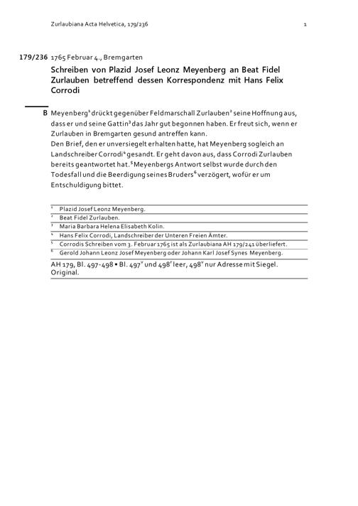 Schreiben von Plazid Josef Leonz Meyenberg an Beat Fidel Zurlauben betreffend dessen Korrespondenz mit Hans Felix Corrodi