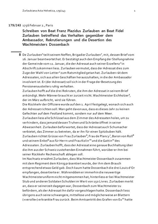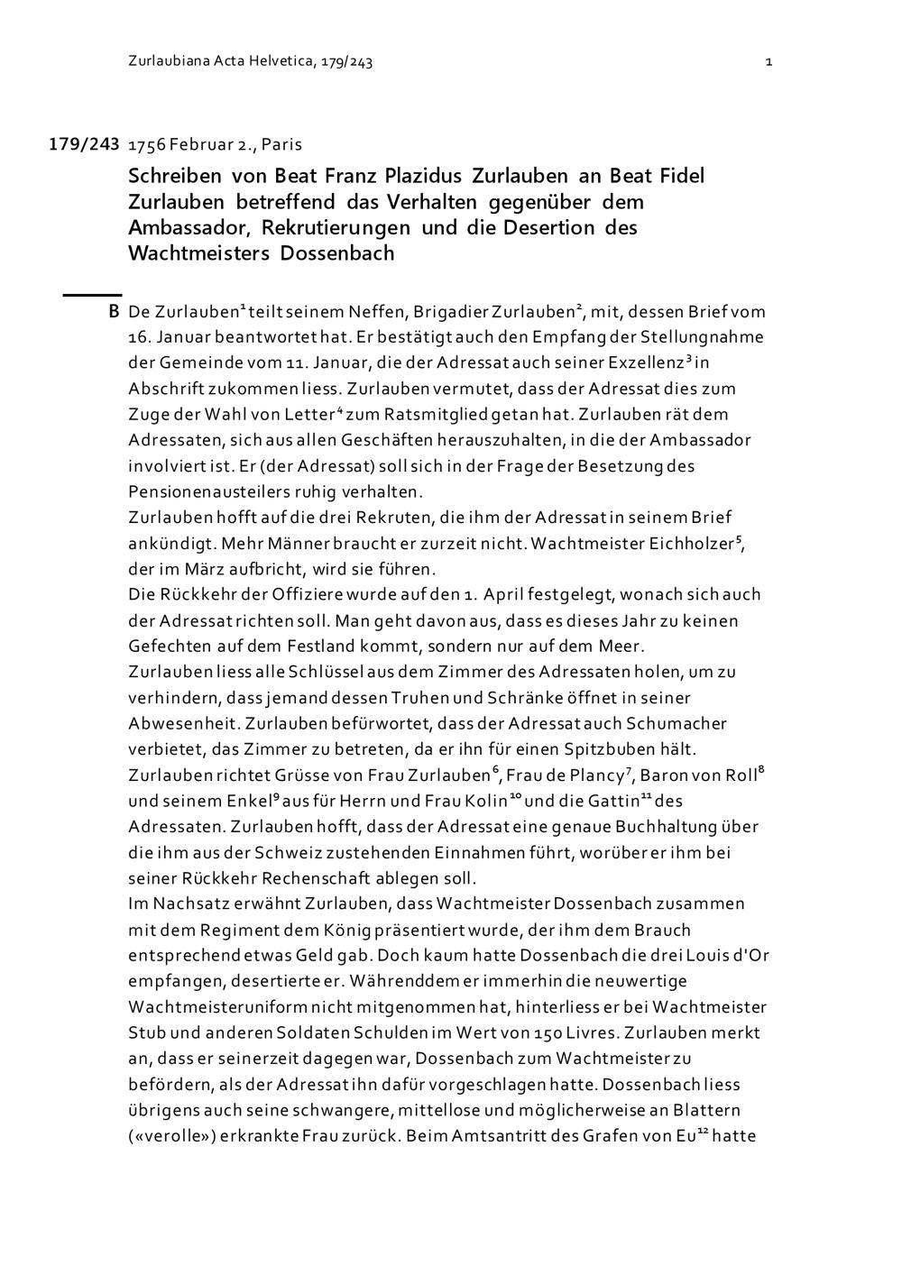 Schreiben von Beat Franz Plazidus Zurlauben an Beat Fidel Zurlauben betreffend das Verhalten gegenüber dem Ambassador, Rekrutierungen und die Desertion des Wachtmeisters Dossenbach