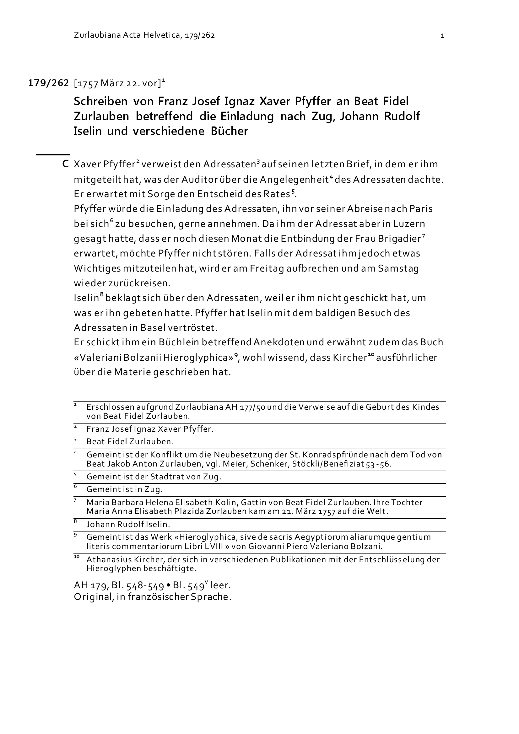 Schreiben von Franz Josef Ignaz Xaver Pfyffer an Beat Fidel Zurlauben betreffend die Einladung nach Zug, Johann Rudolf Iselin und verschiedene Bücher
