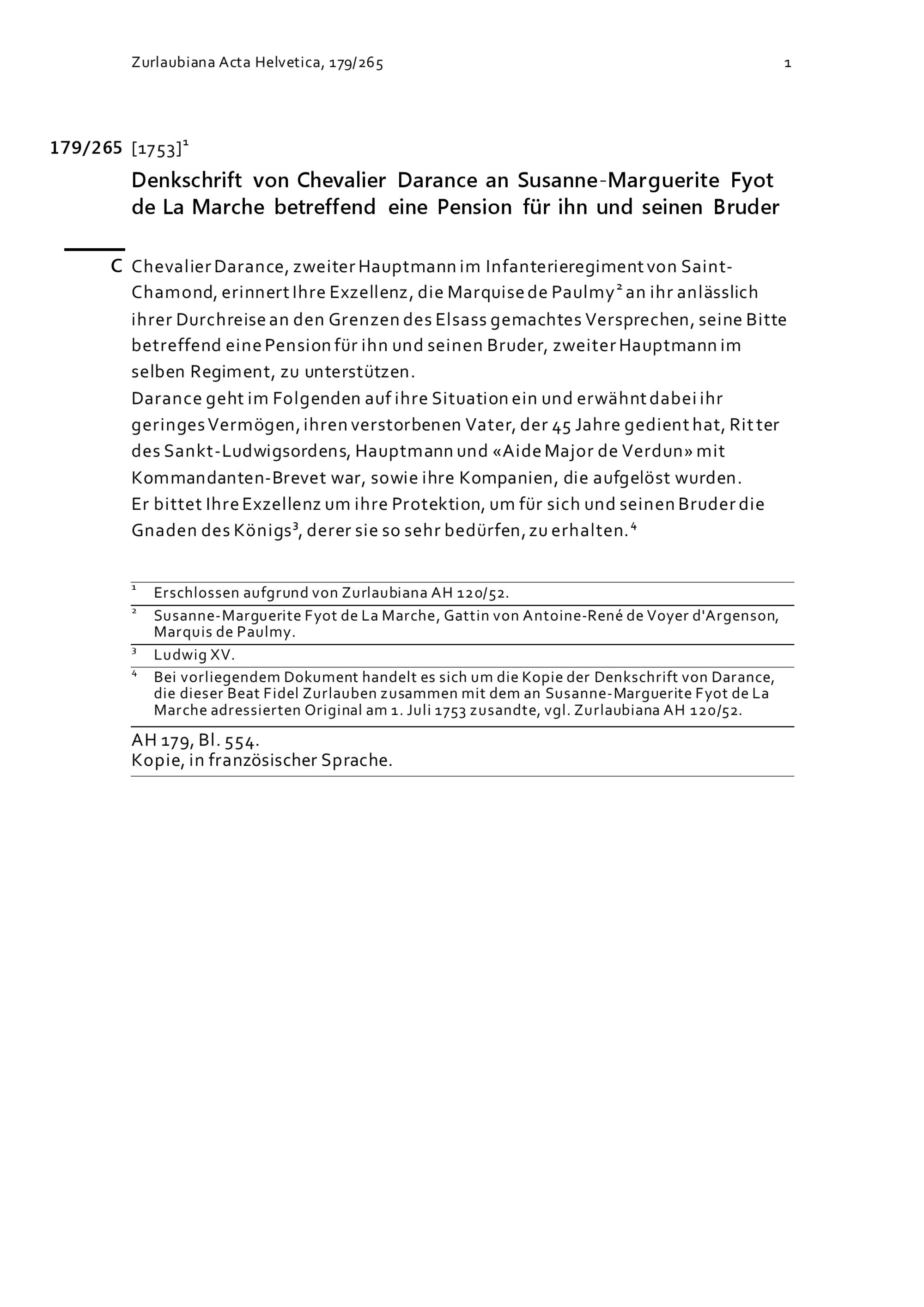 Denkschrift von NN Darance an Susanne-Marguerite Fyot de La Marche betreffend eine Pension für ihn und seinen Bruder