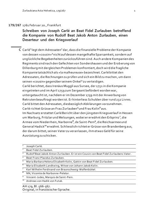 Schreiben von Joseph Carlé an Beat Fidel Zurlauben betreffend die Kompanie von Rudolf Beat Jakob Anton Zurlauben, einen Deserteur und den Kriegsverlauf